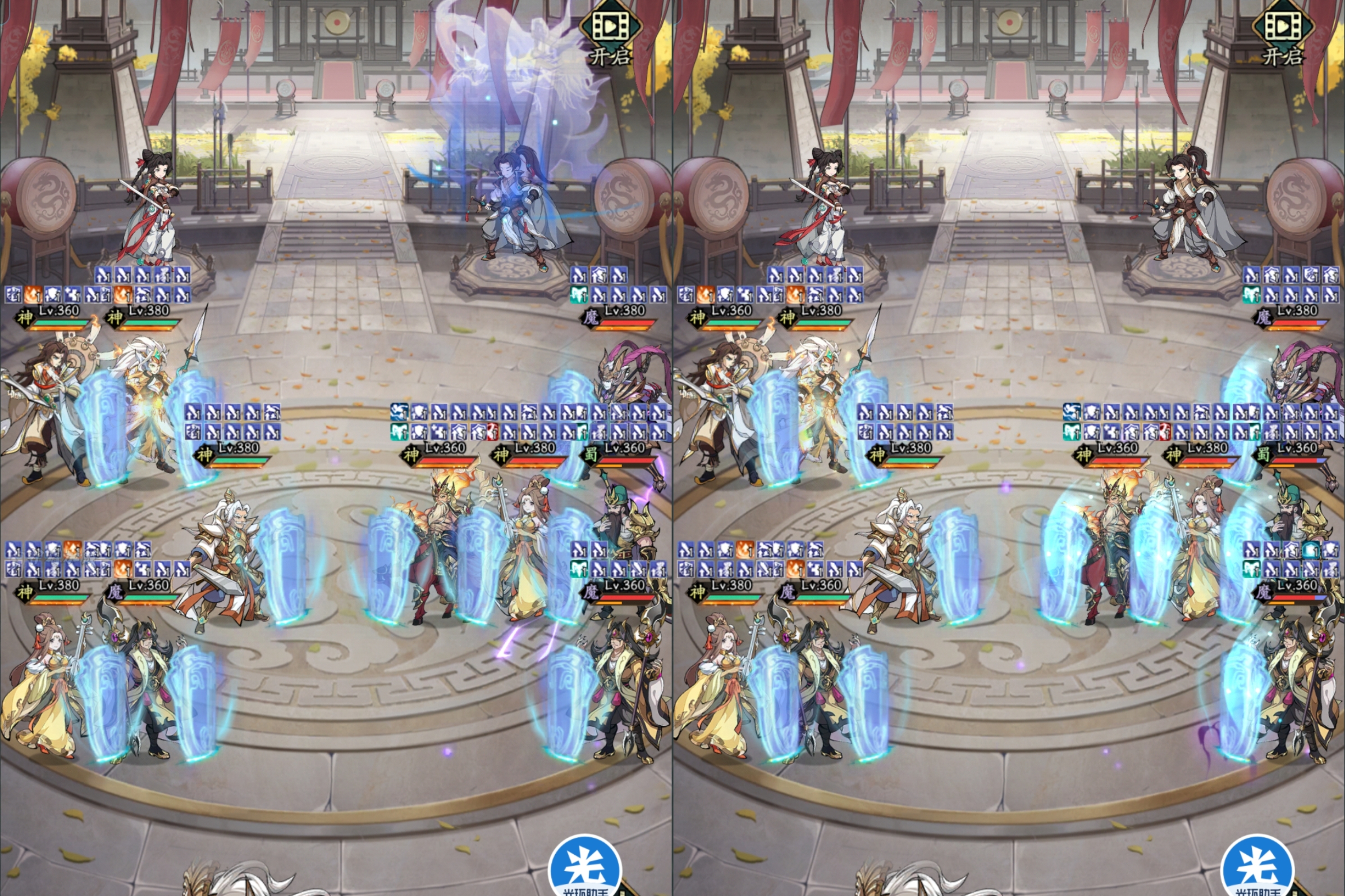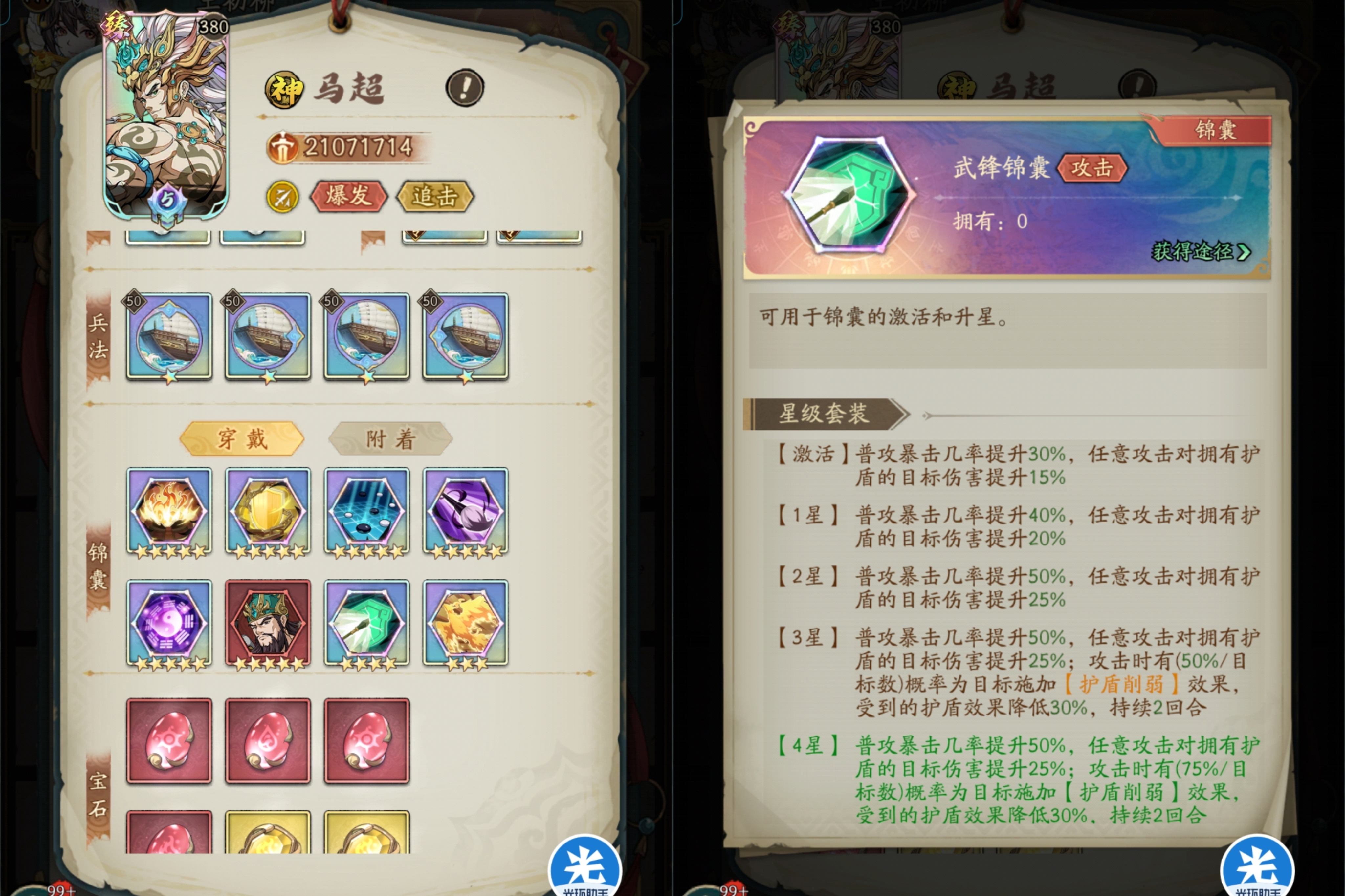 ⭐3件套:马云禄生命降到80%/60%/40%时候,会立刻给我方全体武将施加1层的风魄之护,同时提升15%抗暴几率,加强了马云禄的护盾和保护效果,让风魄之护能够全体套盾了。
