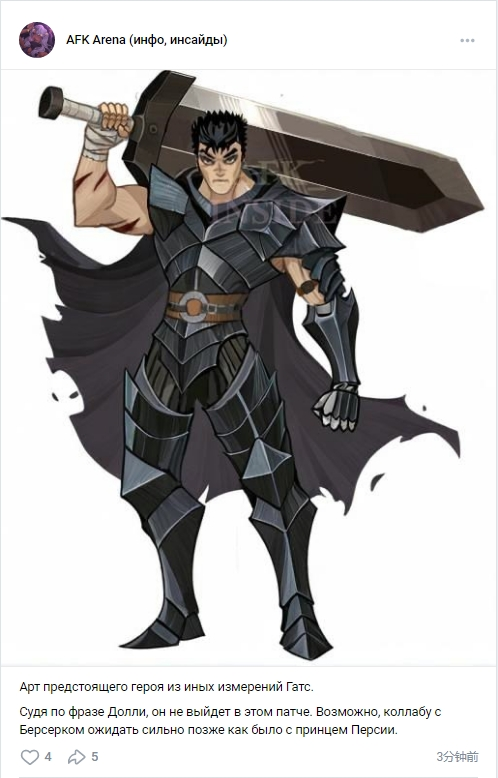 【爆料】新虚空联动 - 剑风传奇动漫主角,格斯剑与远征 - 攻略星发布于 2025-04-02关注从多莉的话来看,格斯在下个补丁中不会出现。可能要等很久,或许比上次波斯王子爆料到正式上线,等待的时间要长得多。对了,鉴于今天是特别的日子,如果有人不相信也无所谓,无非就是个还没上线的虚空角色罢了,也不是啥热门的动漫角色。盒子君这次纯搬运国外知名AFK博主的爆料推文。 转载自:剑与远征小屋