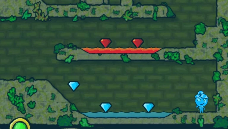 在每个关卡中,均散布着红色和蓝色两种钻石,分别需要火焰和水滴角色才能获得,某些关卡会用钻石来引诱玩家走进错误的路线,所以行进过程需要擦亮双眼哦!