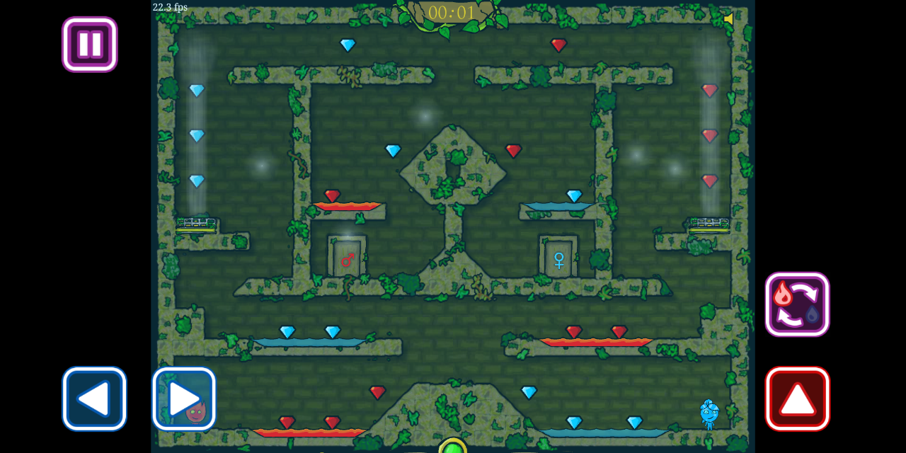 在这款游戏中,触屏的操作方式简单而直接,屏幕上分别为左右移动、跳跃和切换四个按钮,玩家需要在水滴和火焰之间合理切换,才能顺利抵达关卡的出口。