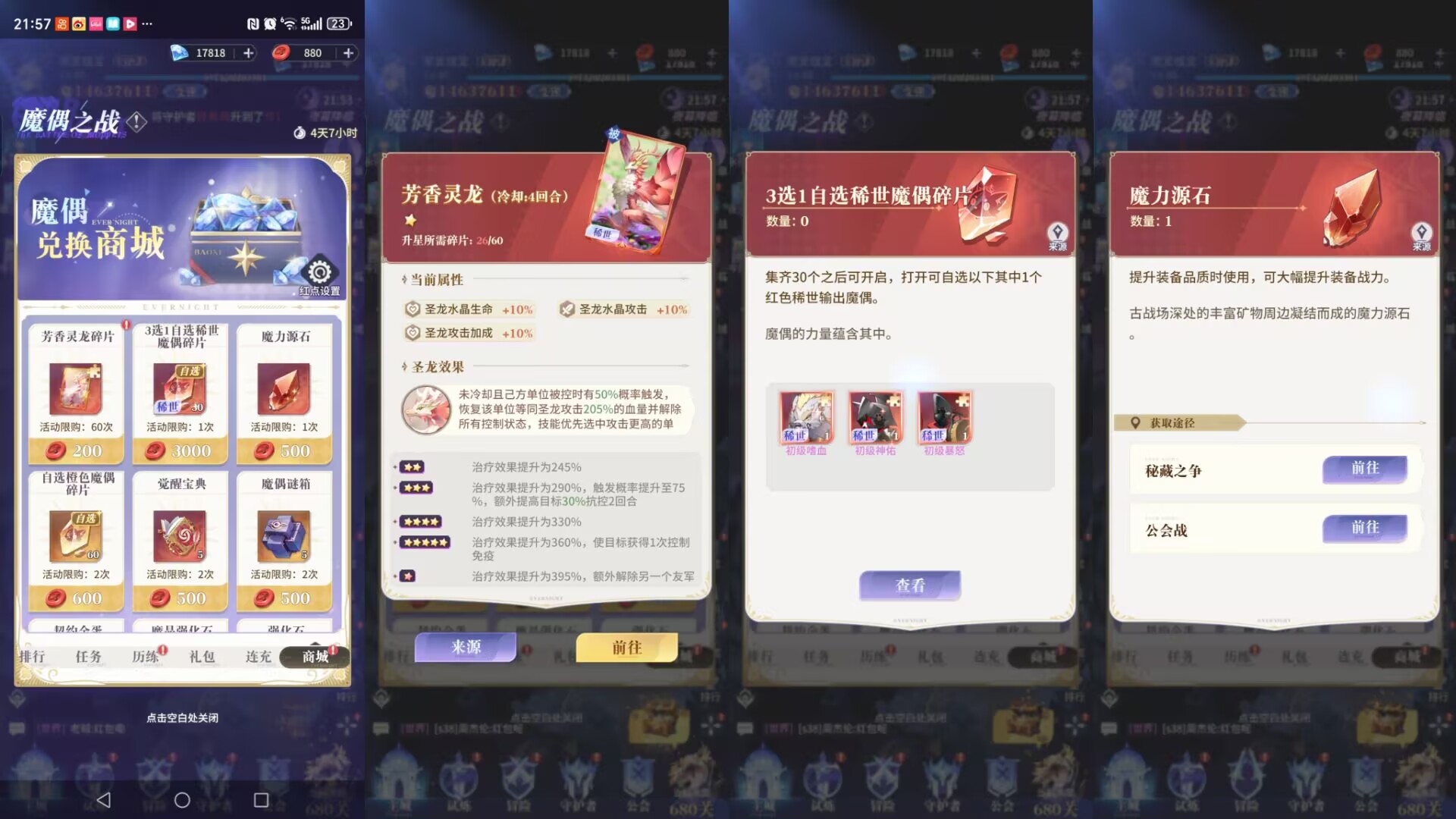 优先兑换:①魔力源石、②灵龙碎片、③自选稀世魔偶。