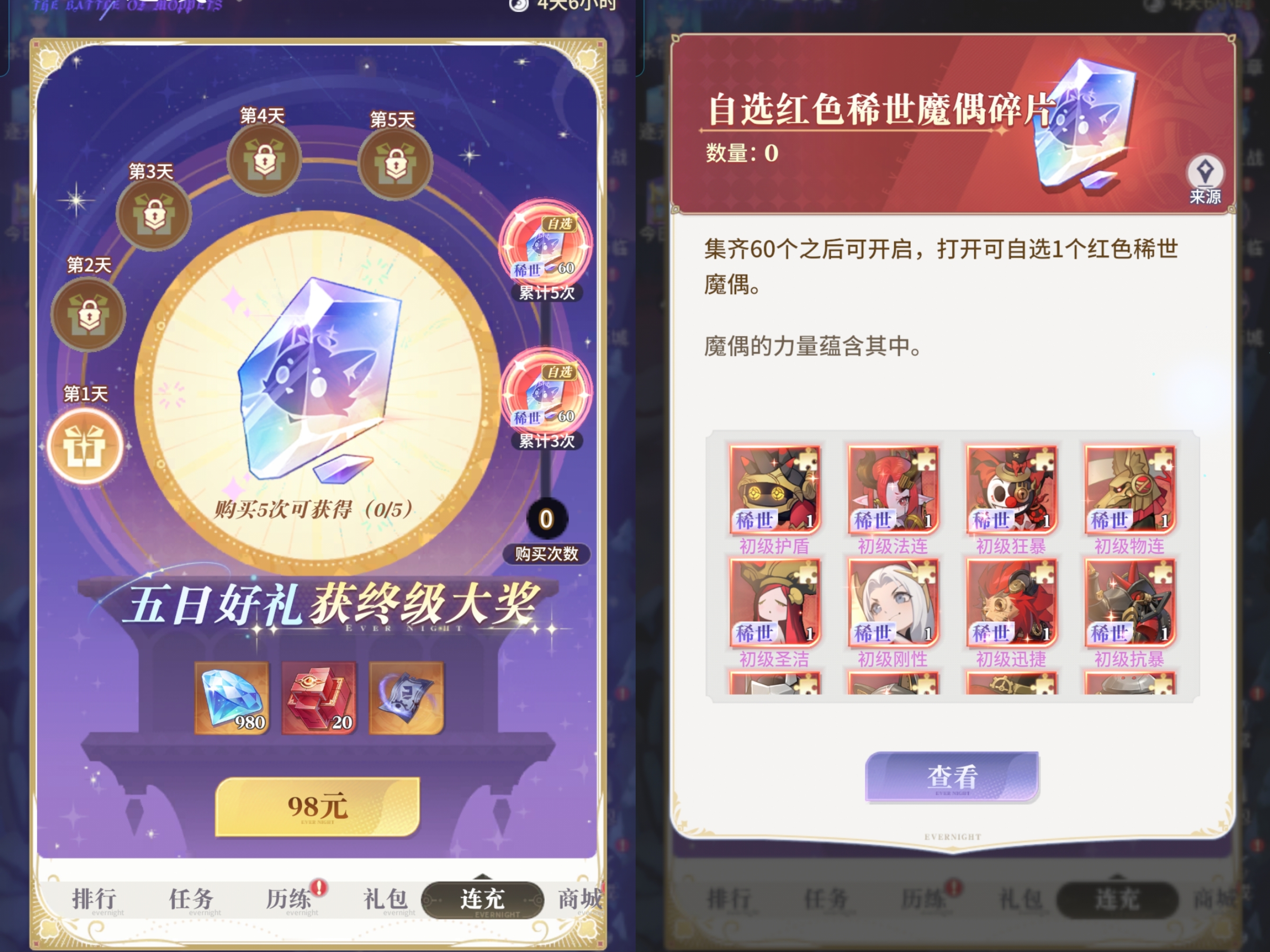 五:【魔偶之战】连充。每天冲98元可以获得980钻石+20高级魔偶箱子+1张净世卷。