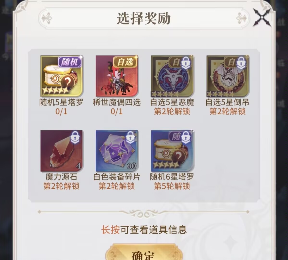 ①第一轮200抽可以选择:随机5星塔罗牌/稀世魔偶自选。