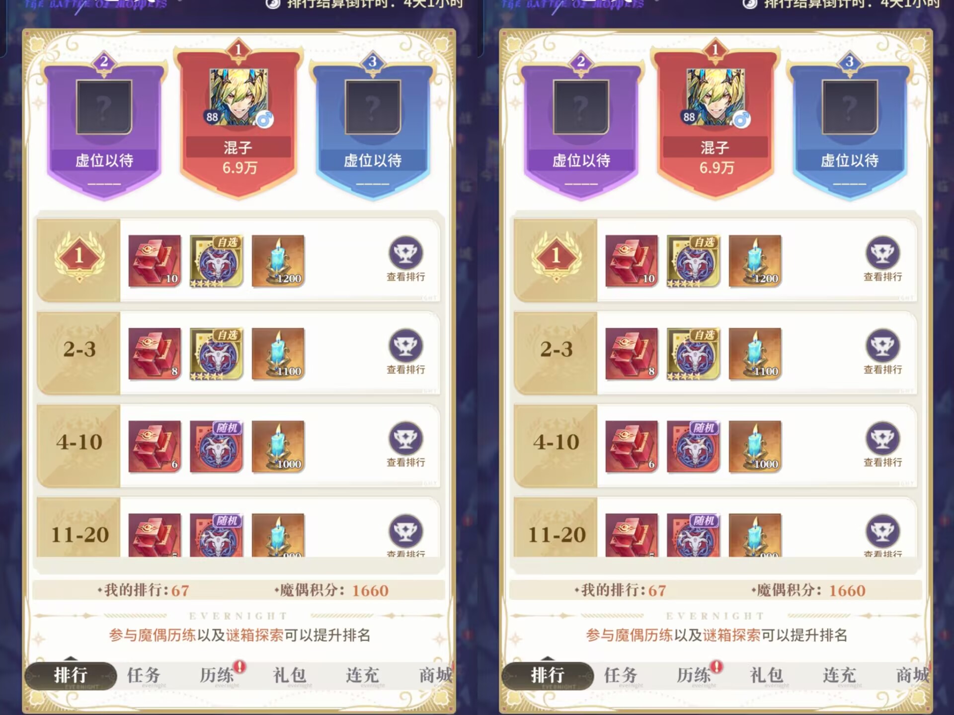 至于前十名基本上和咱们平民玩家无缘了!很多玩家抢前十名,也不太建议平民玩家花太多钻石在这个活动上刷积分抢前十名。