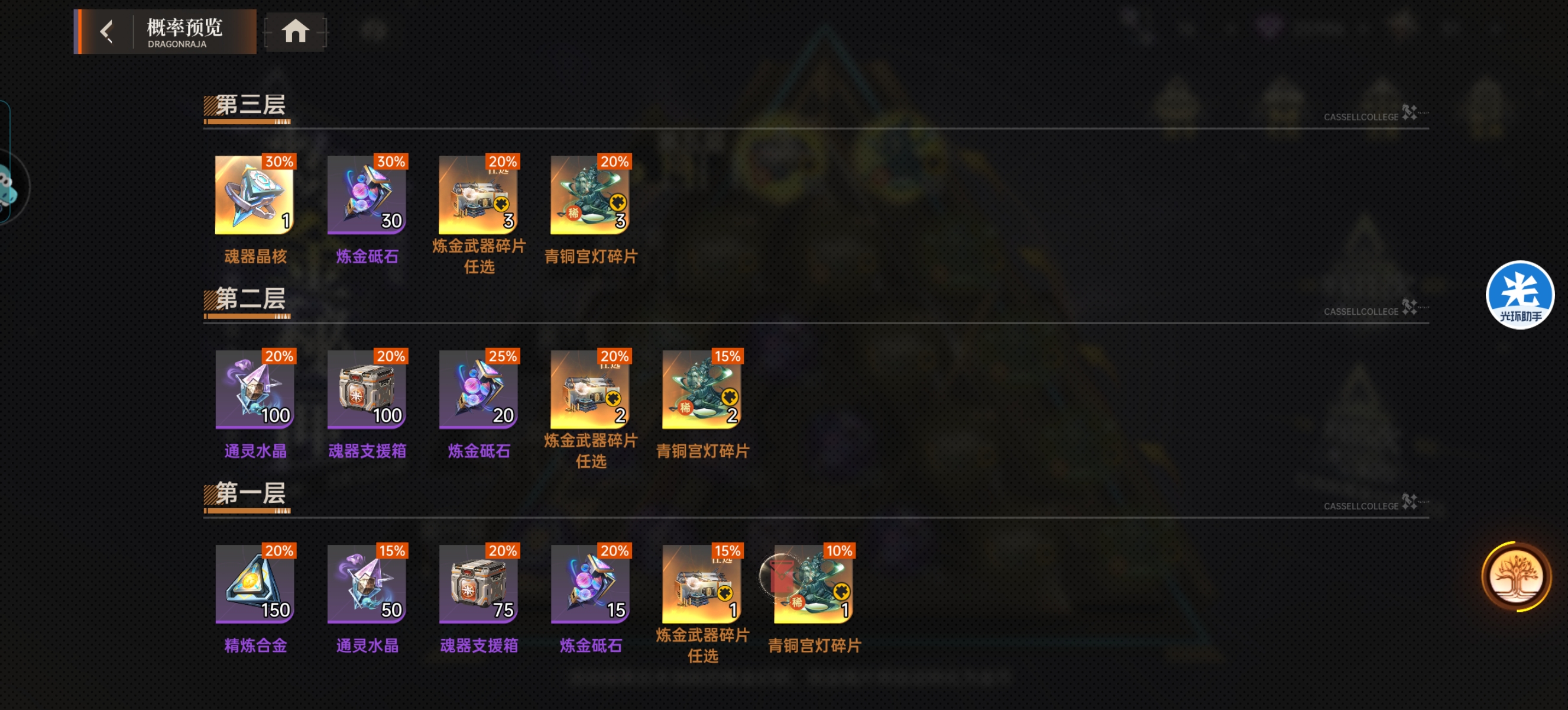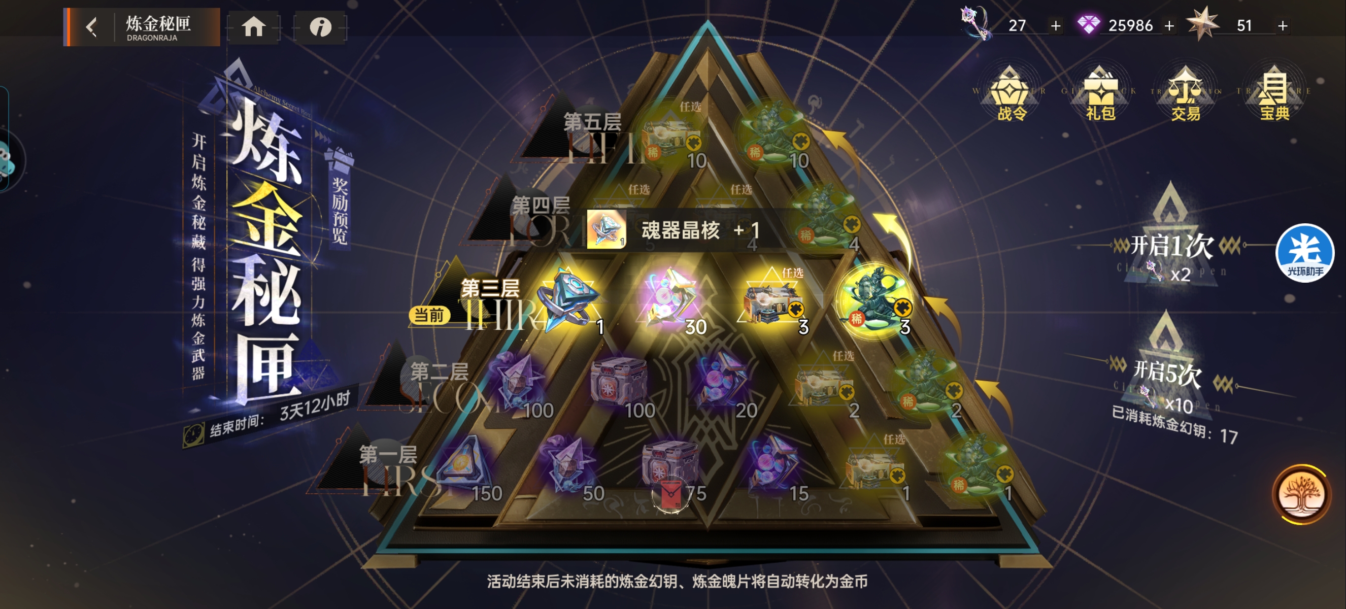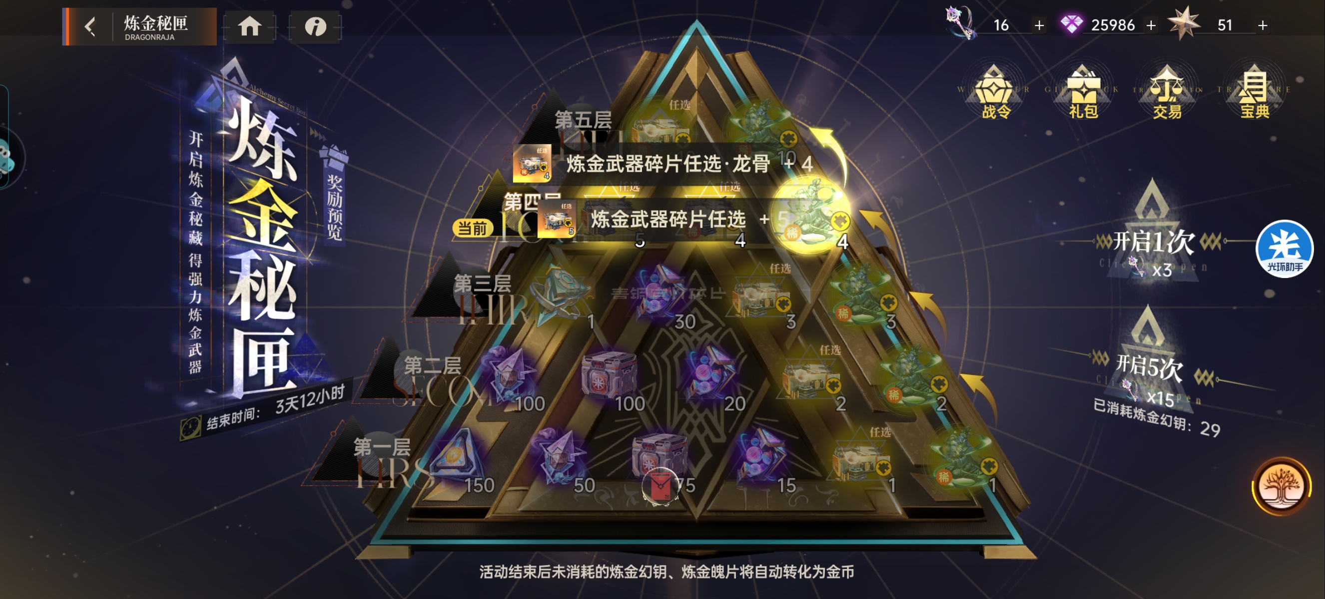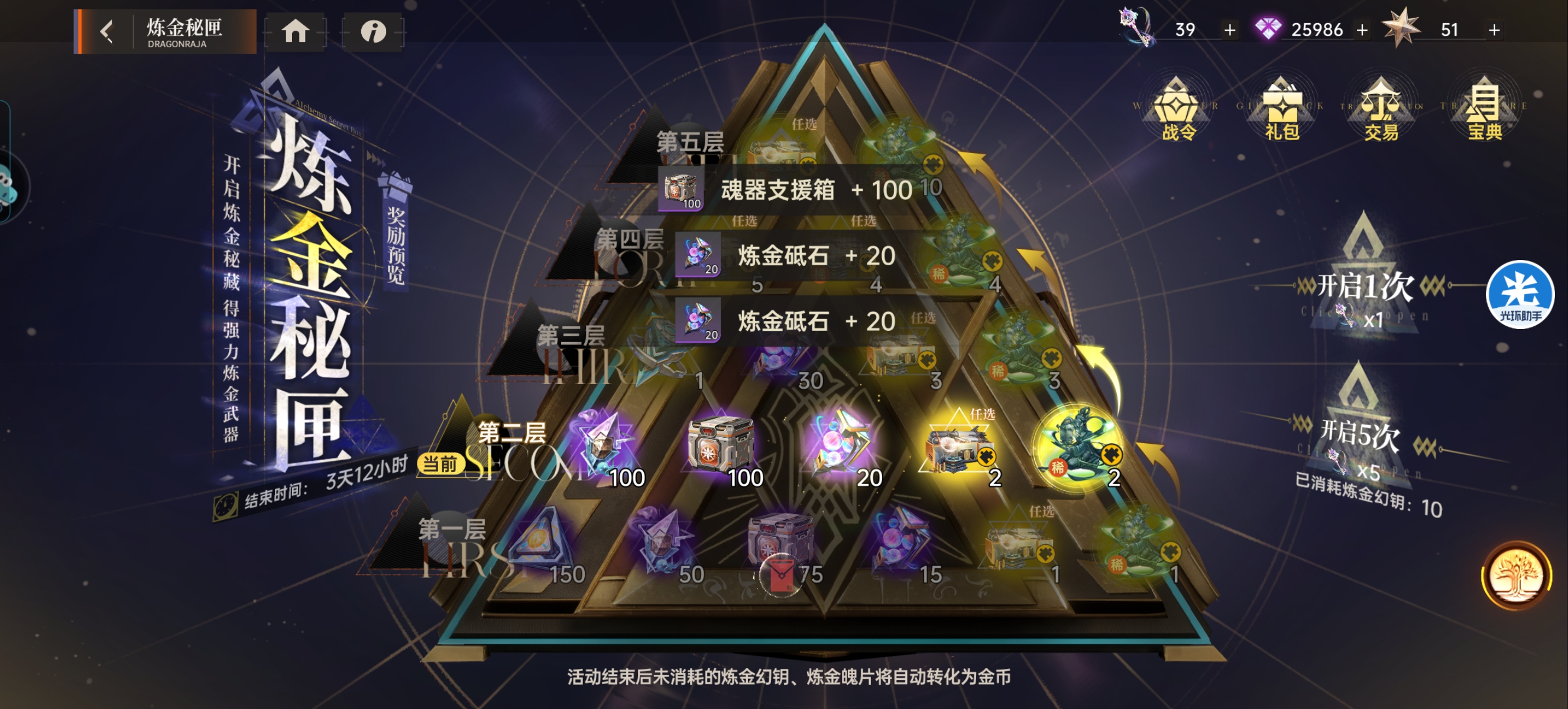 ①炼金秘匣:奖励一共有5层,通过消耗【炼金钥匙】来上升奖励层数。
