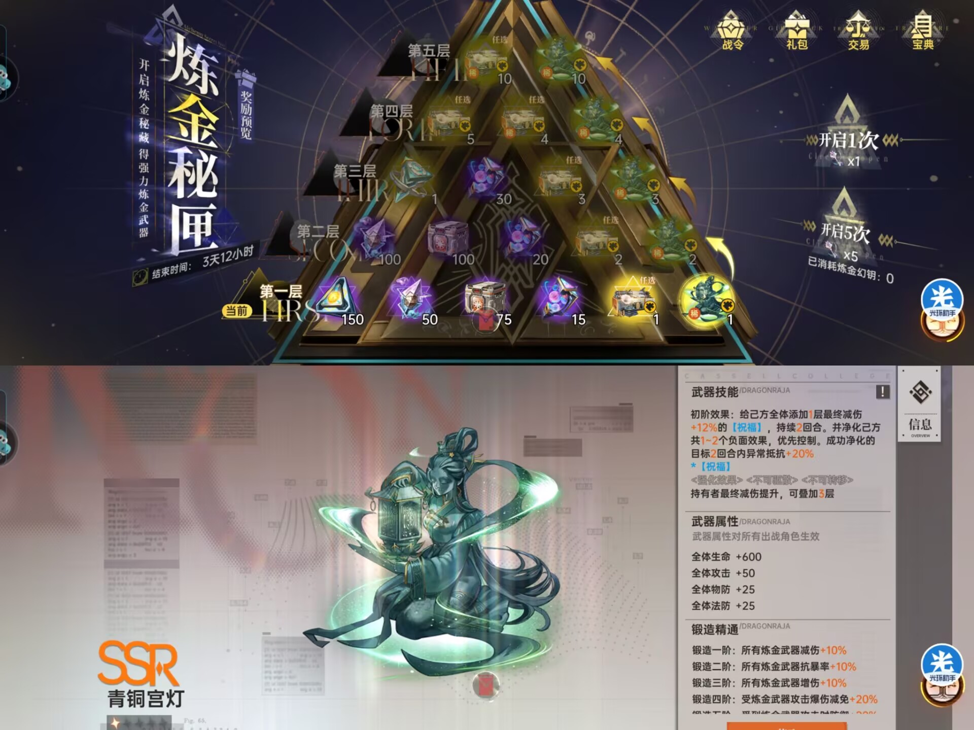 三:【活动最后要点总结】。①新炼金武器青铜古灯很强大!能够给整个队伍提升高额的生存能力和净化负面以及控制!是氪佬pvp必备必抽的炼金武器,缺点是低星不好用!起码抽到觉醒是起步,平民玩家只能看看。