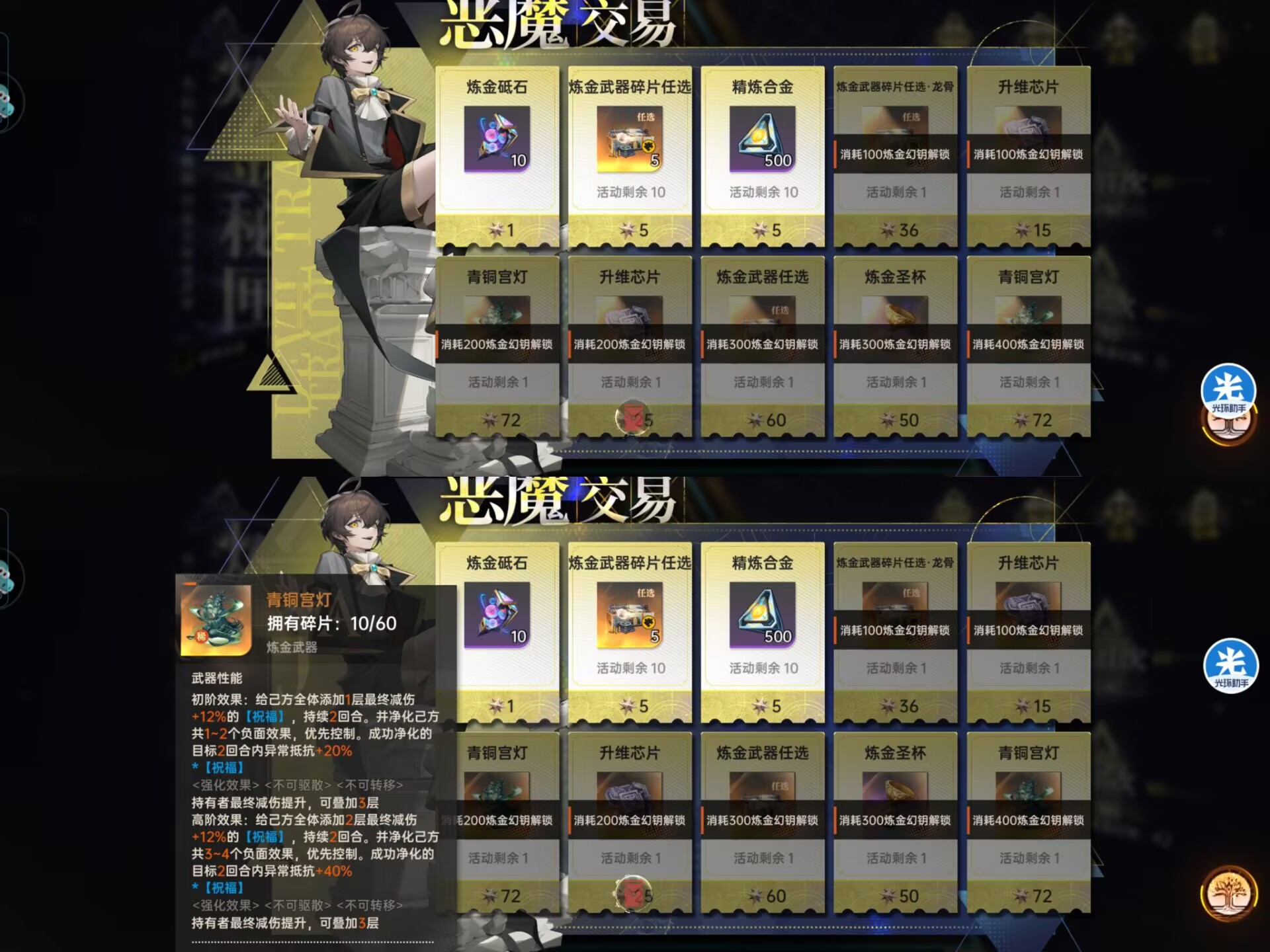 其次青铜宫灯低星没啥作用!起码觉醒1星以后才有作用!而想把这个新炼金武器升到觉醒没有3000元是拿不下来的。