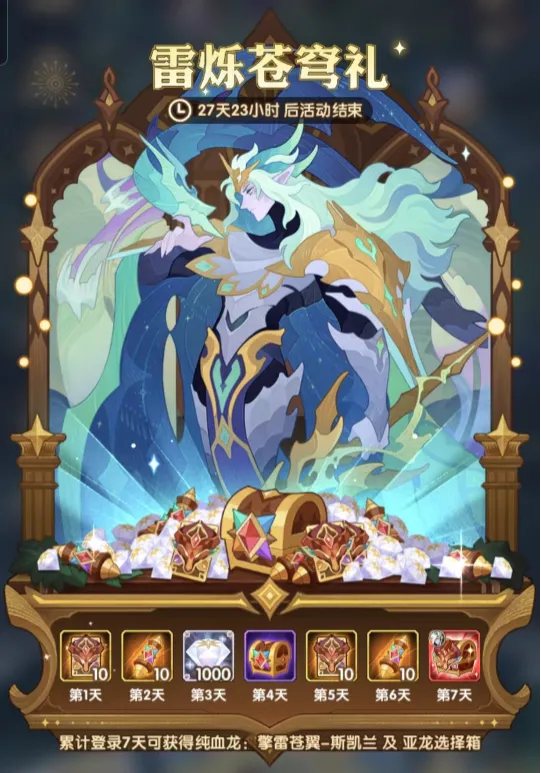 ◇活动简述:活动期间冒险者累计登录七天,可领取钻石、龙语卷轴、龙血纹章、亚龙英雄选择箱、纯血龙“擎雷苍翼-斯凯兰”等丰厚奖励。