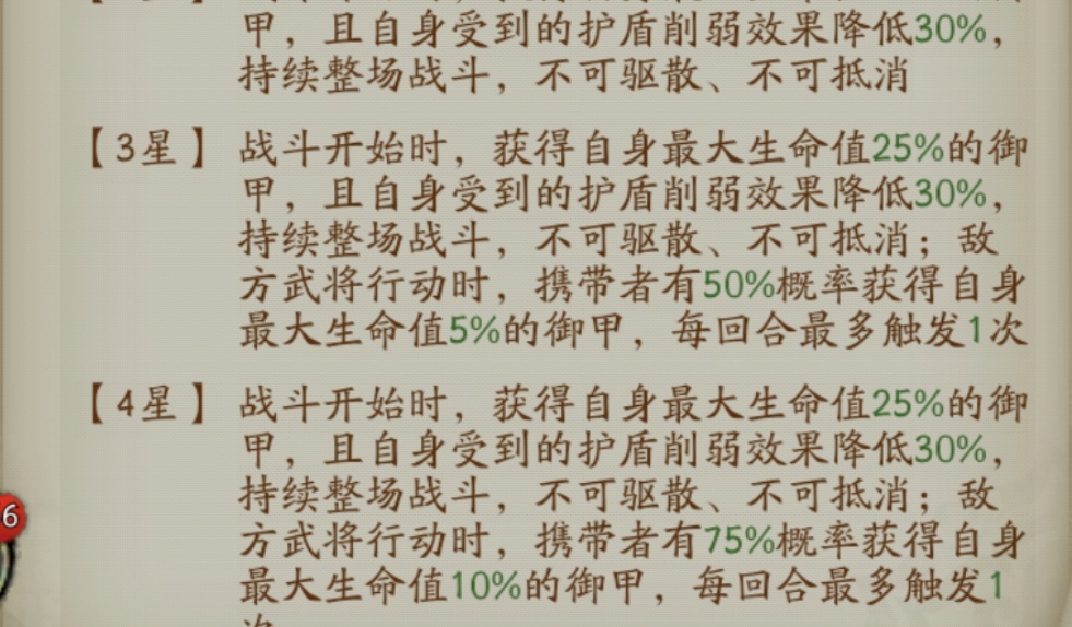 敌方武将行动后,有50%可以再次获得自身最大生命值5%的御甲。