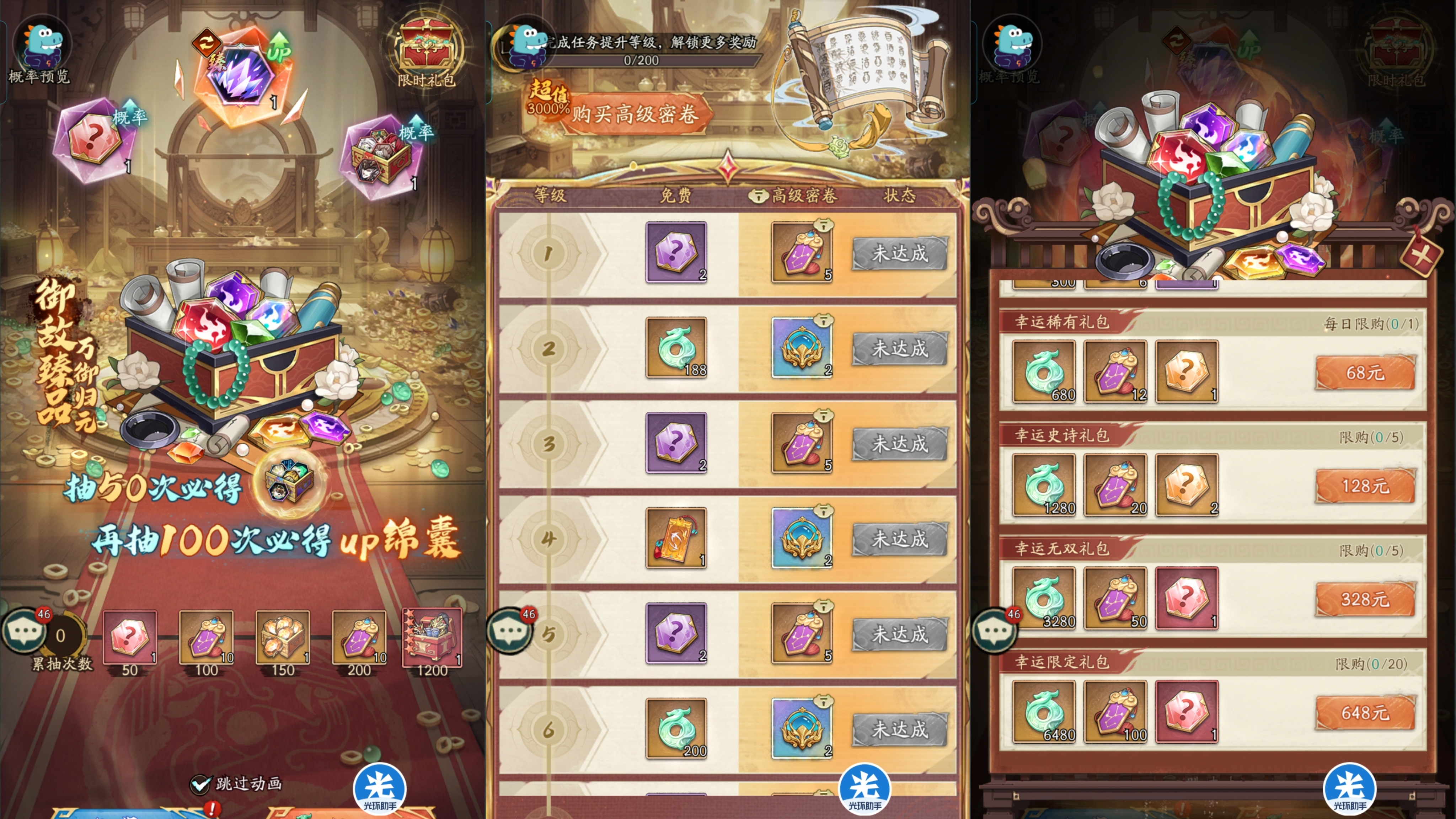 ③然后买30元礼包买7次+68元礼包买4次+6元礼包买7次+128元礼包买2次+648元礼包买3次