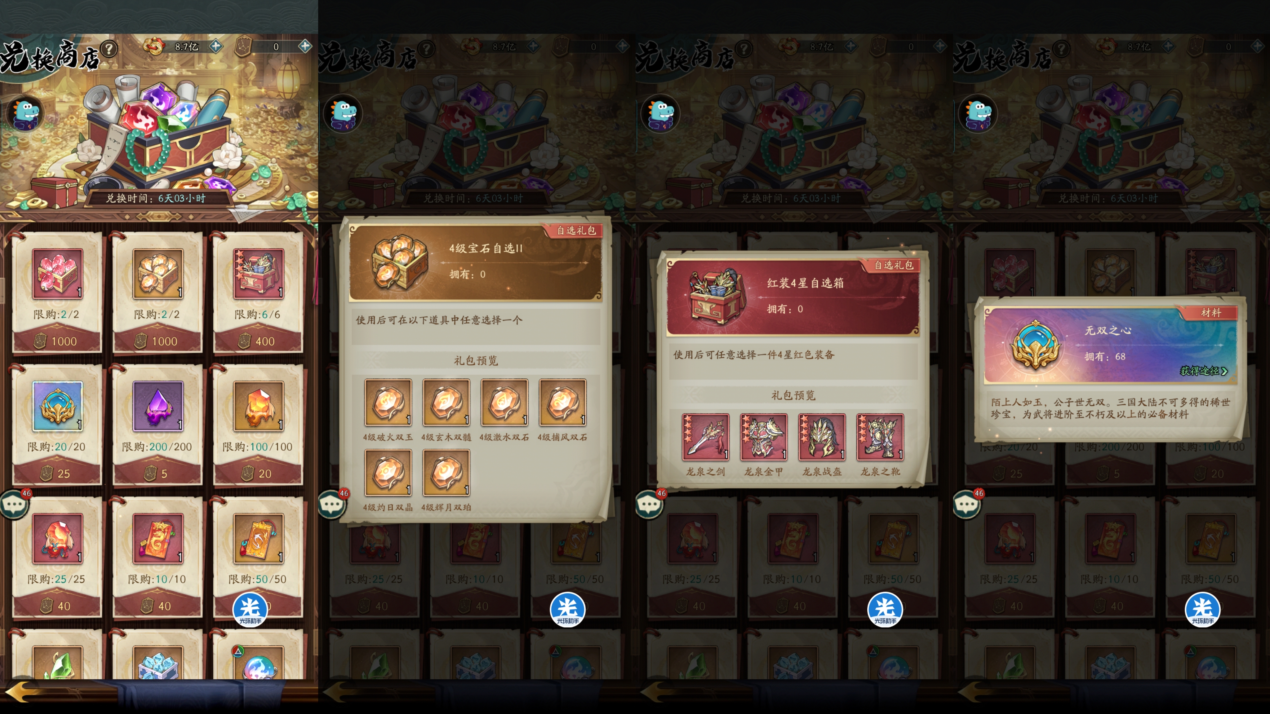 ①优先兑换双属性宝石、红4星雄装备、无双之心。
