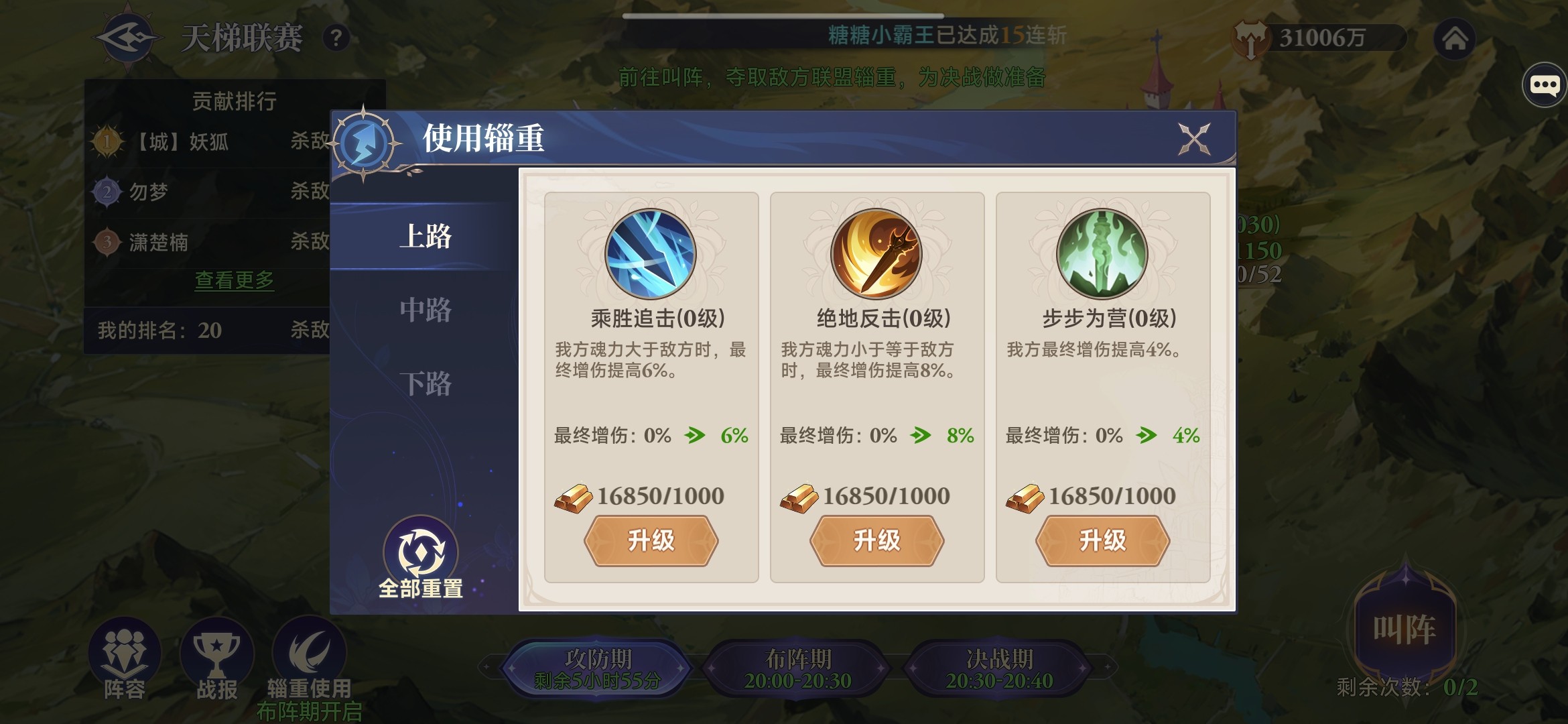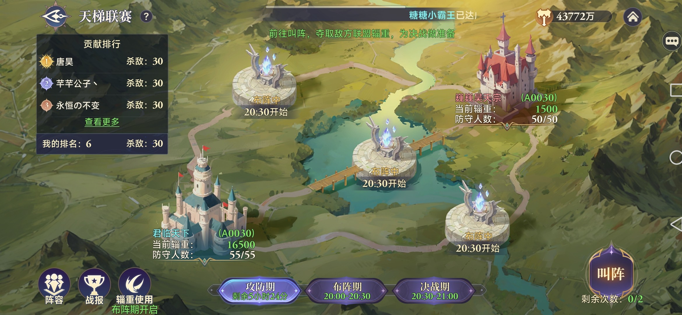 ②布防期(20点-20点30分):只有联盟盟主、副盟主可以操作,将联盟辎重兑换为我方3条路线的强力增益效果,增加胜利几率,同时调整比赛阶段的玩家,每条路线可以分别安排19人、18人、18人。