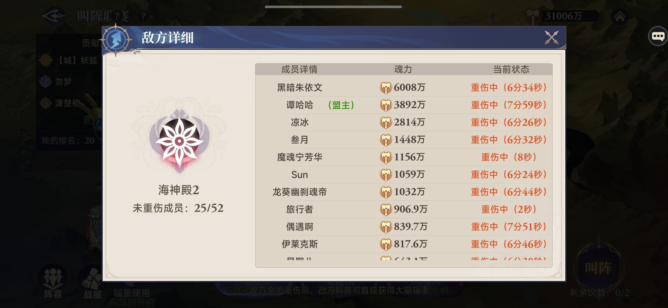 ※随时关注敌人重伤数量,不足15人时,我方叫阵会在击败所有敌人后停止,此时将直接掠夺敌方较多联盟辎重,但没有灵纹之书奖励,需要统筹把握好。