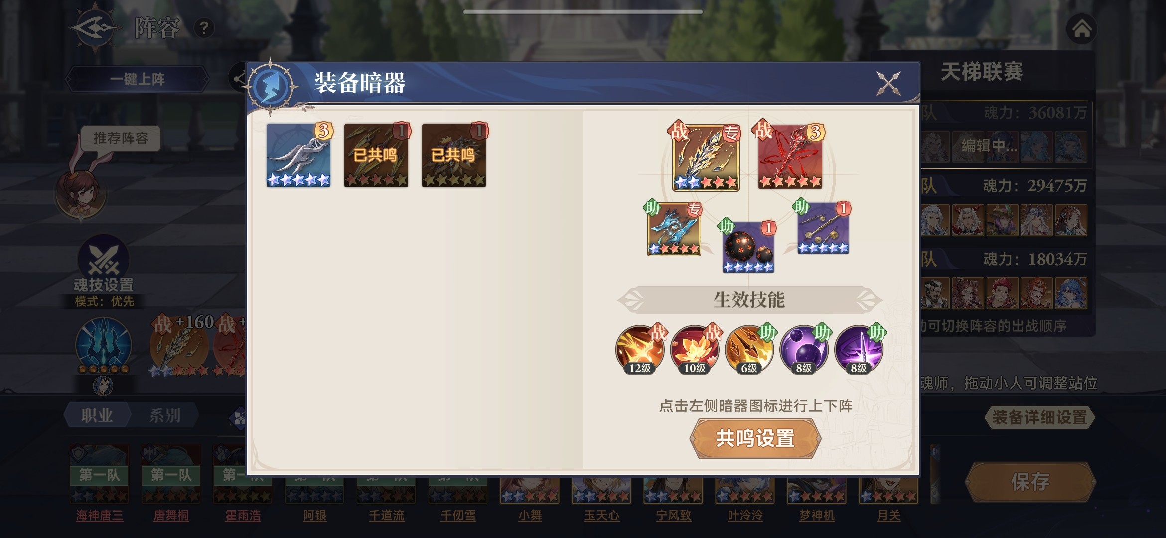 2.合理分配暗器。集中暗器资源到我方强队,特别是传说以上暗器要搭配阵容使用。比如,凤引九雏、菩提血搭配唐舞桐队,将减武魂进行到底;阎王帖搭配修罗小舞队,最大化输出能力。