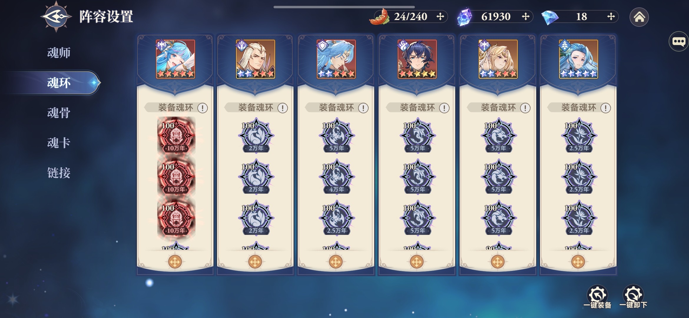 3.配好魂环魂骨。①魂环:零氪、微氪的唐舞桐等输出魂师练度不高,生存能力有限,如果站不住,建议第一、第四魂环装配甲盾系,其他都带猛兽系,保证能够持续输出。中氪、顶氪的输出魂师可以全部装配猛兽系,提高极限输出能力。