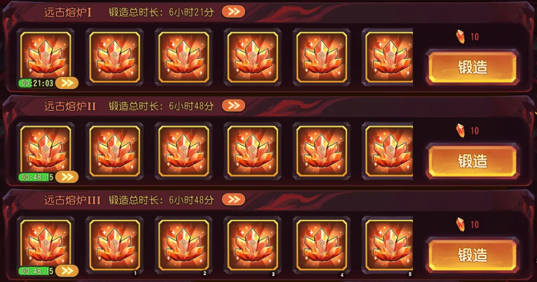 至于锻造加速,可用可不用,新系统上线会送不少,想加速就加速。可以稍微留一部分用在,睡觉前加速掉还没锻造完的格子,重新进一个满CD即可。千万别用钻石加速,也别花资源去兑换加速燃料,后面赤晶都不够了谁还加速呢?纯纯的智商税。