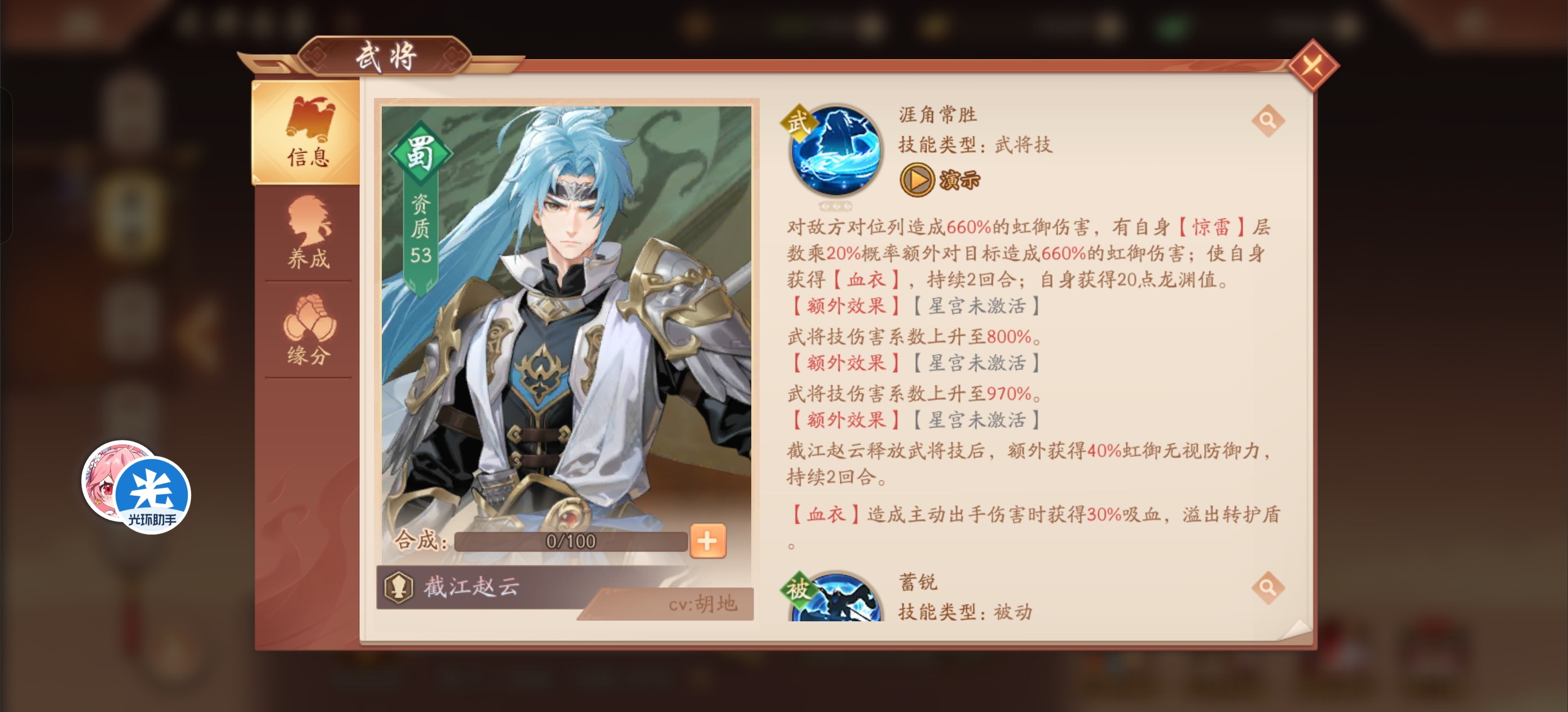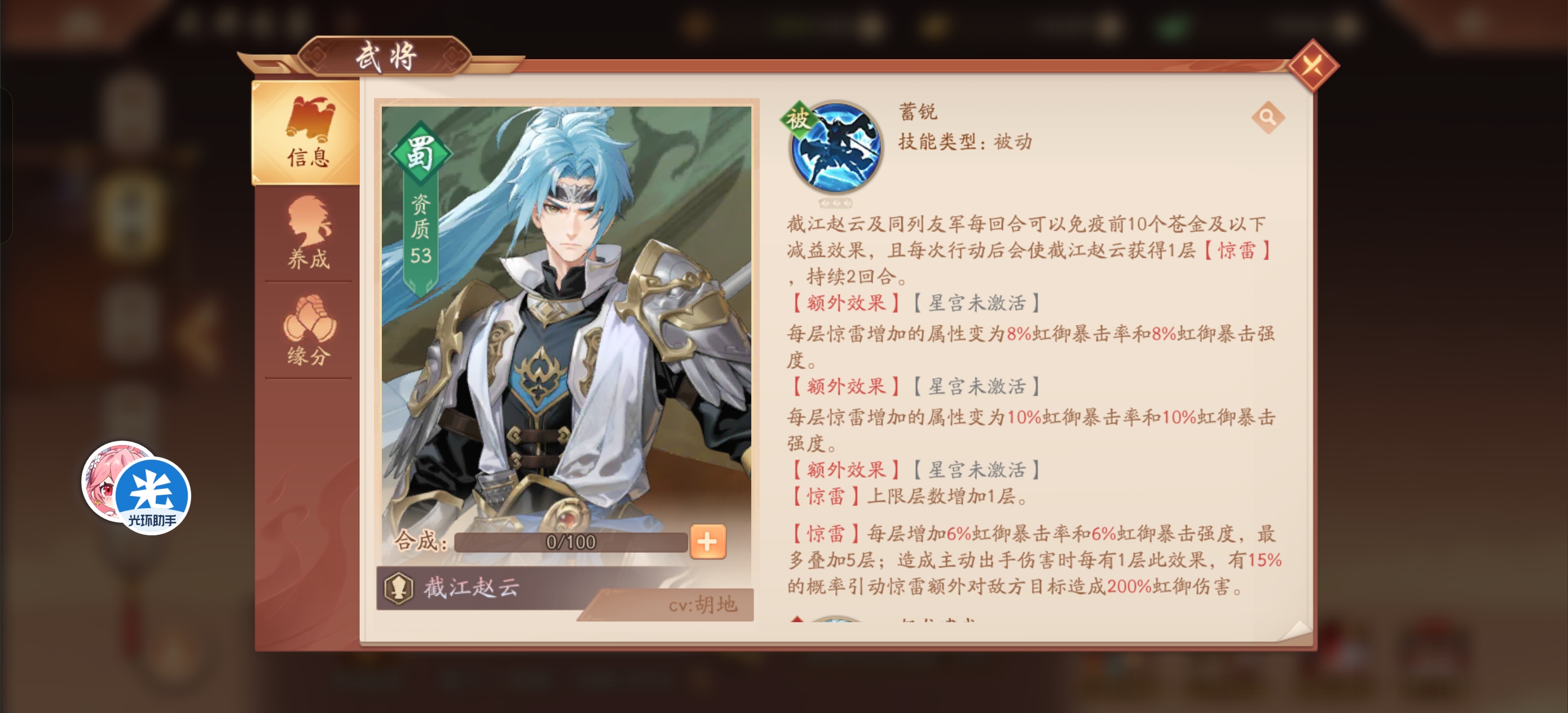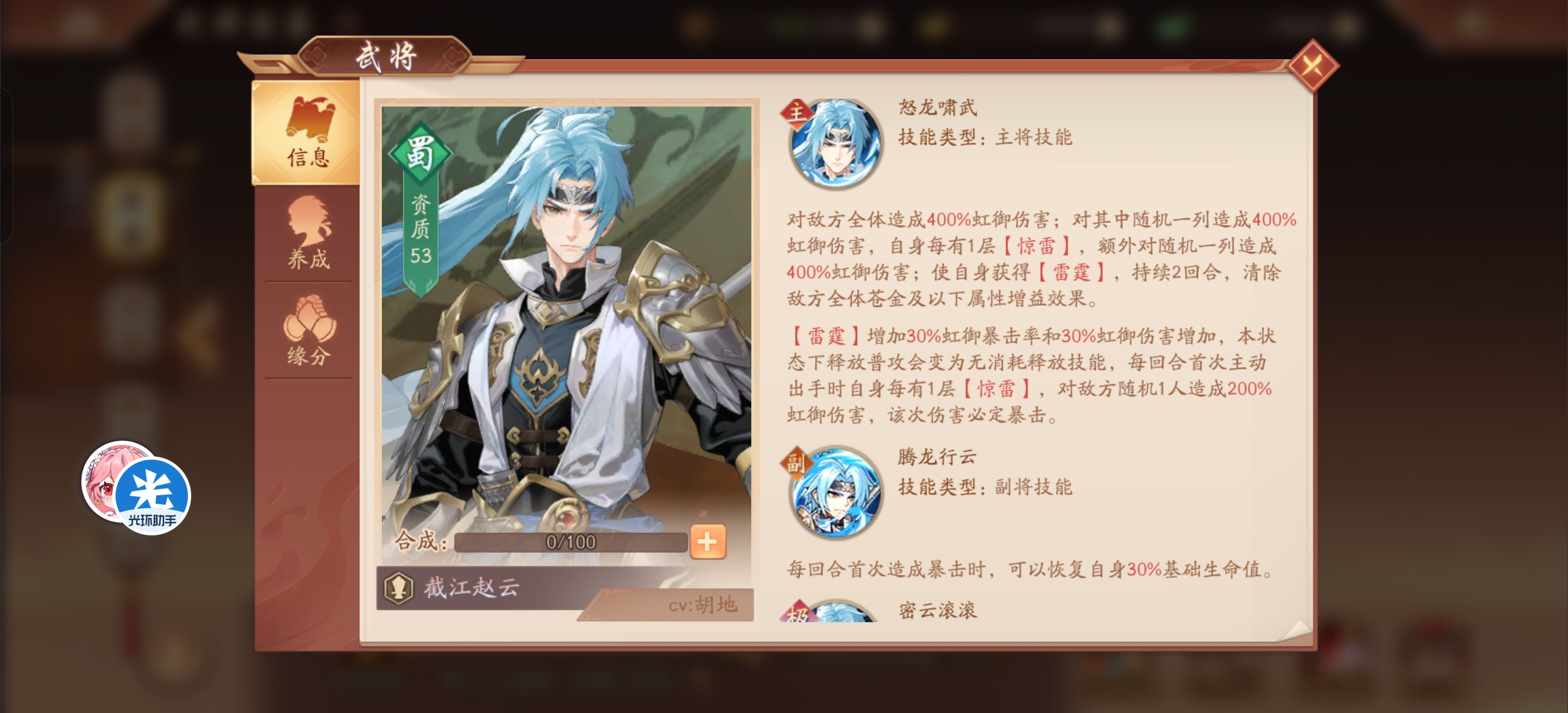 【天池太子】雷霆连动-截江赵云天池太子发布于 2025-04-10关注大家好,我是天池太子 现在说到了蜀国第一个虹金将截江赵云 这熟悉的技能不就是之前的多动症赵云本文首发于光环助手,未经授权不得转载!本文首发于光环助手,转载需注明转自光环助手 普攻是单体 星宫点满变前排 顺序最后点 可有可无的星宫 技能是主要输出 列伤加护盾 点星宫顺序第二 武将技主要是血衣有用点星宫顺序第三 被动点星宫顺序第一 惊雷是主要buff 自身和同列还能免疫减益 主将技能雷霆 普攻连动技能 老操作了 还能清除对方全体苍金增益 赵云极武化龙提升不多 预估要攒100点龙渊 怕是等不到就秒完对面咯炼神加攻击总结截江赵云又是之前的赵云plus版 跟苍狼夏侯惇比一样有吸血 引爆惊雷额外伤害 转护盾PVP会强一点 再来一个多动症 输出和生存是够了 强度暂时第二