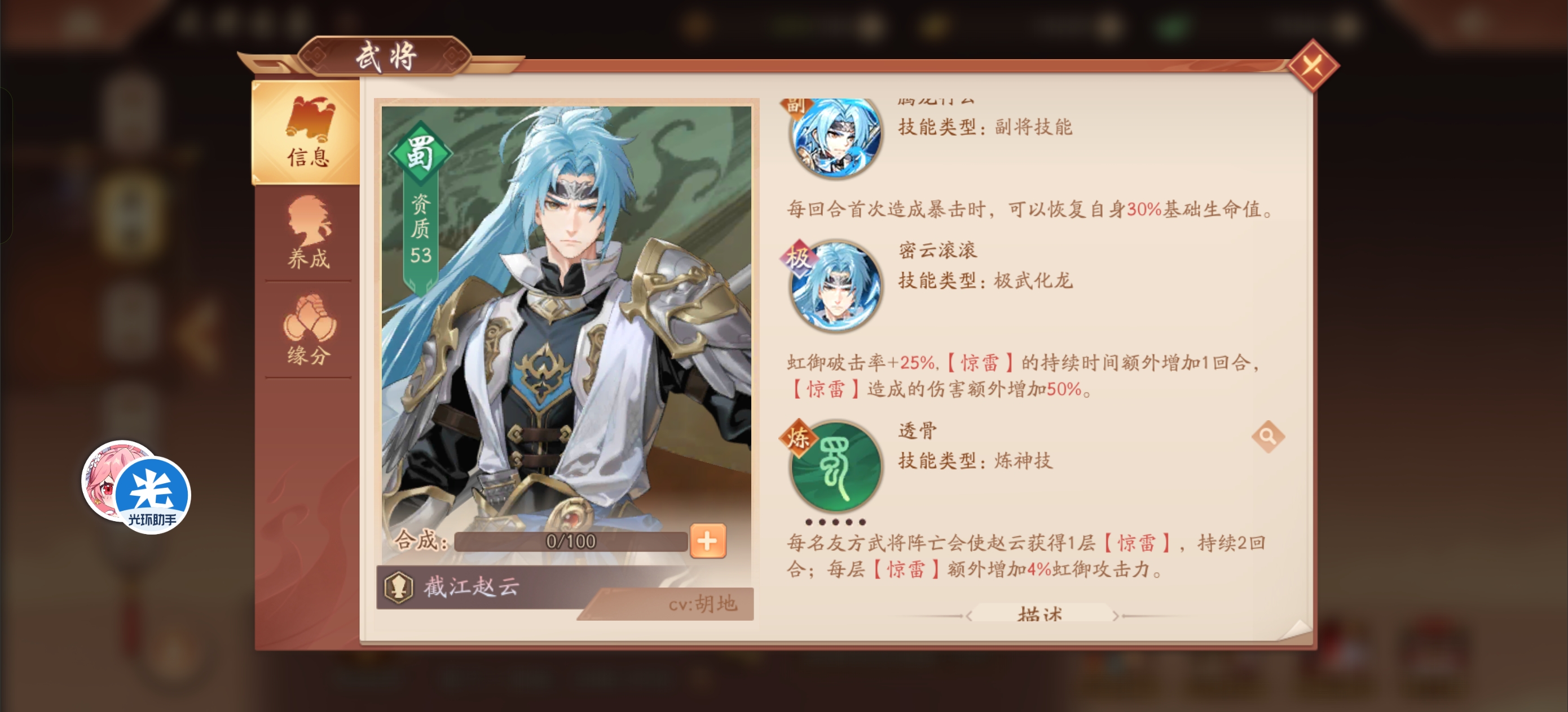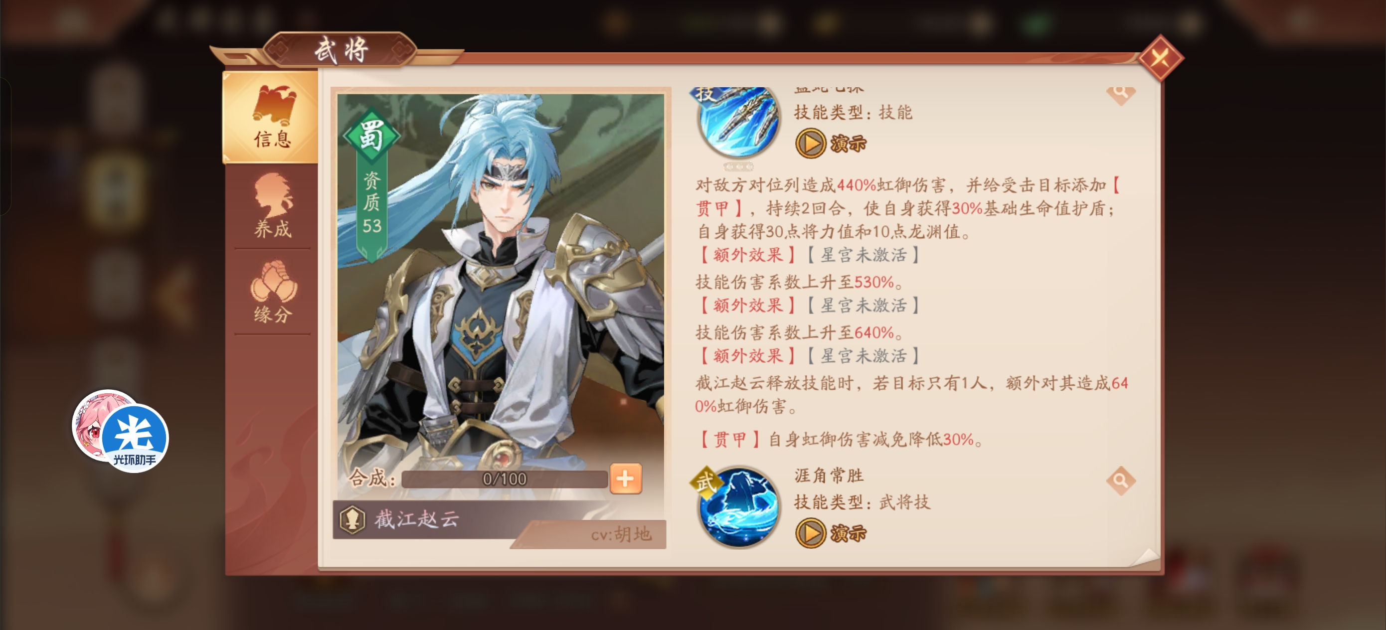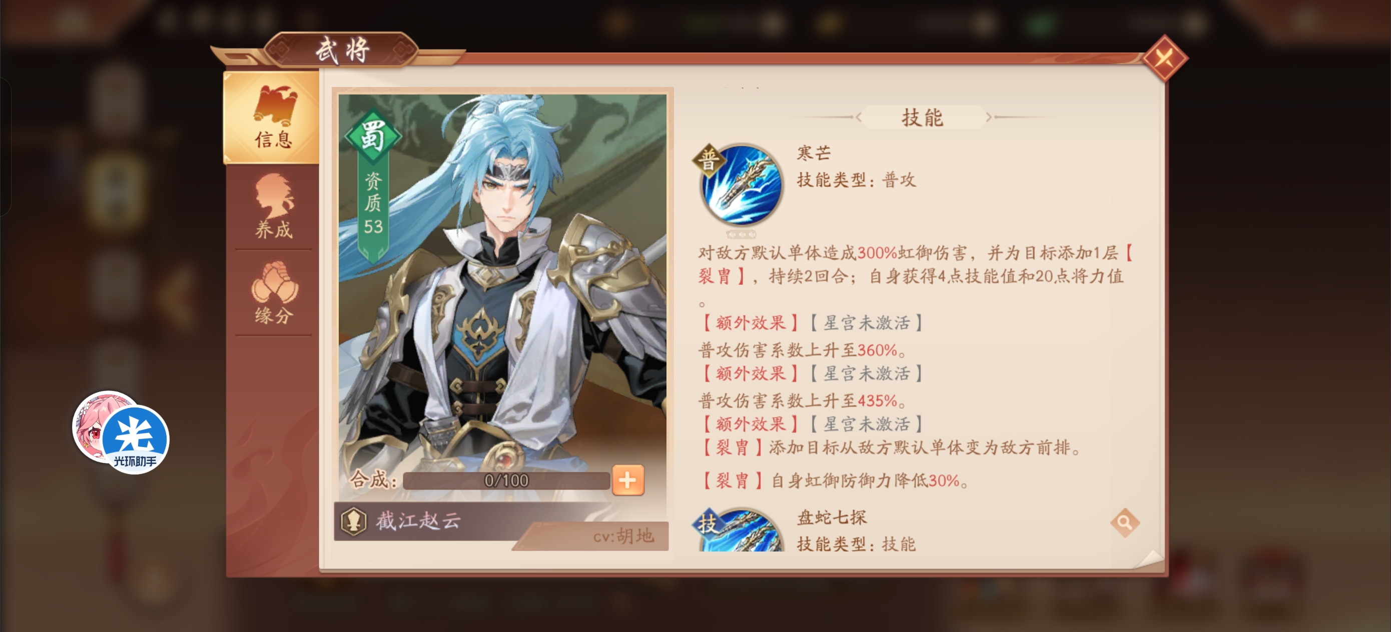 【天池太子】雷霆连动-截江赵云天池太子发布于 2025-04-10关注大家好,我是天池太子 现在说到了蜀国第一个虹金将截江赵云 这熟悉的技能不就是之前的多动症赵云本文首发于光环助手,未经授权不得转载!本文首发于光环助手,转载需注明转自光环助手 普攻是单体 星宫点满变前排 顺序最后点 可有可无的星宫 技能是主要输出 列伤加护盾 点星宫顺序第二 武将技主要是血衣有用点星宫顺序第三 被动点星宫顺序第一 惊雷是主要buff 自身和同列还能免疫减益 主将技能雷霆 普攻连动技能 老操作了 还能清除对方全体苍金增益 赵云极武化龙提升不多 预估要攒100点龙渊 怕是等不到就秒完对面咯炼神加攻击总结截江赵云又是之前的赵云plus版 跟苍狼夏侯惇比一样有吸血 引爆惊雷额外伤害 转护盾PVP会强一点 再来一个多动症 输出和生存是够了 强度暂时第二
