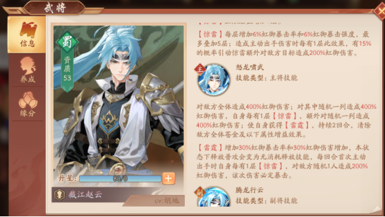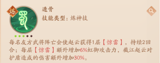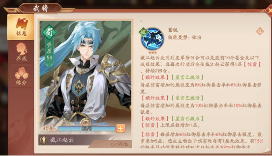 截江赵云及同列友军每回合可以免疫前10个苍金及以下减益效果,且每次行动后会使截江赵云获得1层【惊雷】,持续2回合。