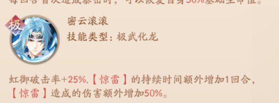 增加30%的虹御暴击率和30%虹御伤害增加,本状态下释放普攻时将会变为释放一次无消耗的技能。且每回合首次主动出手时,自身每有1层数的【惊雷】,对敌方随机1人造成200%的虹御伤害,该次伤害必定暴击。