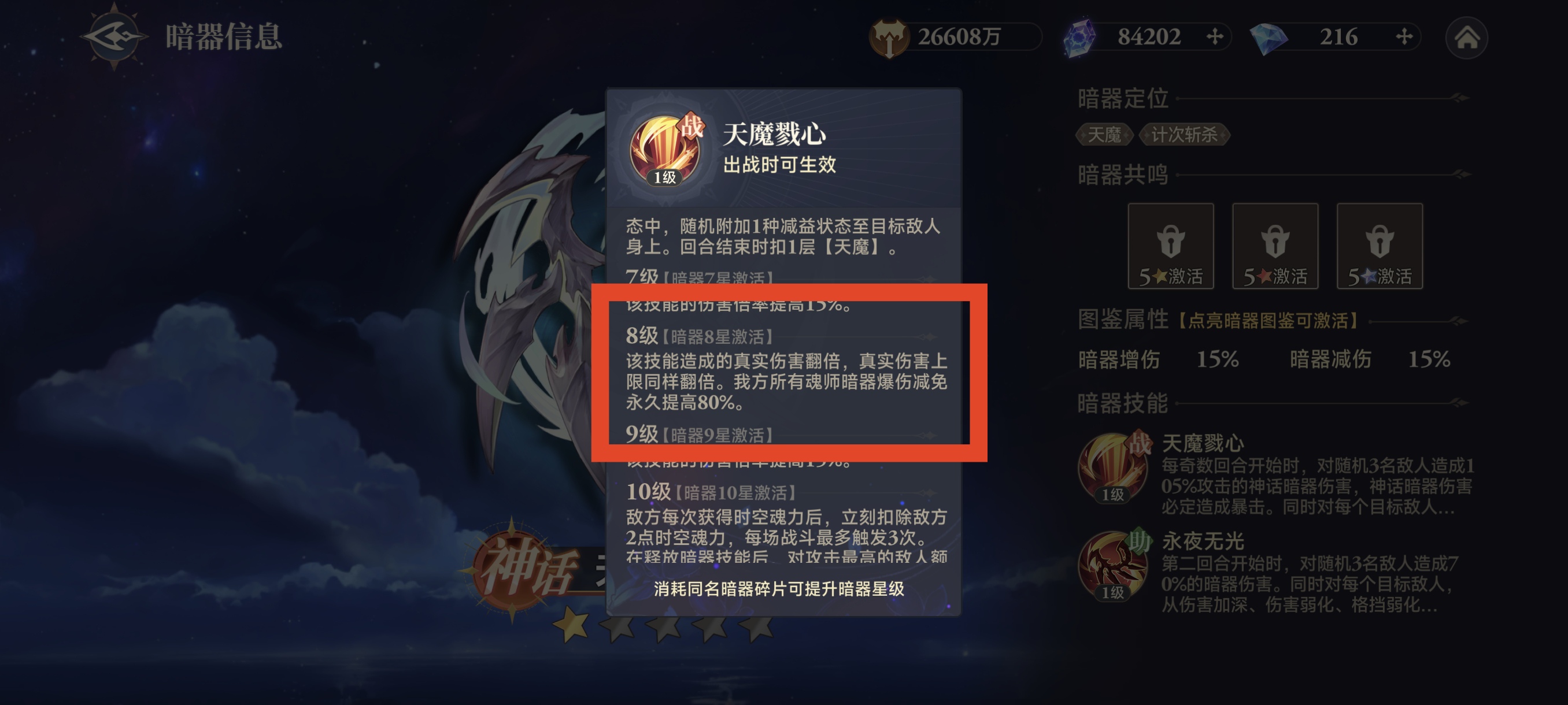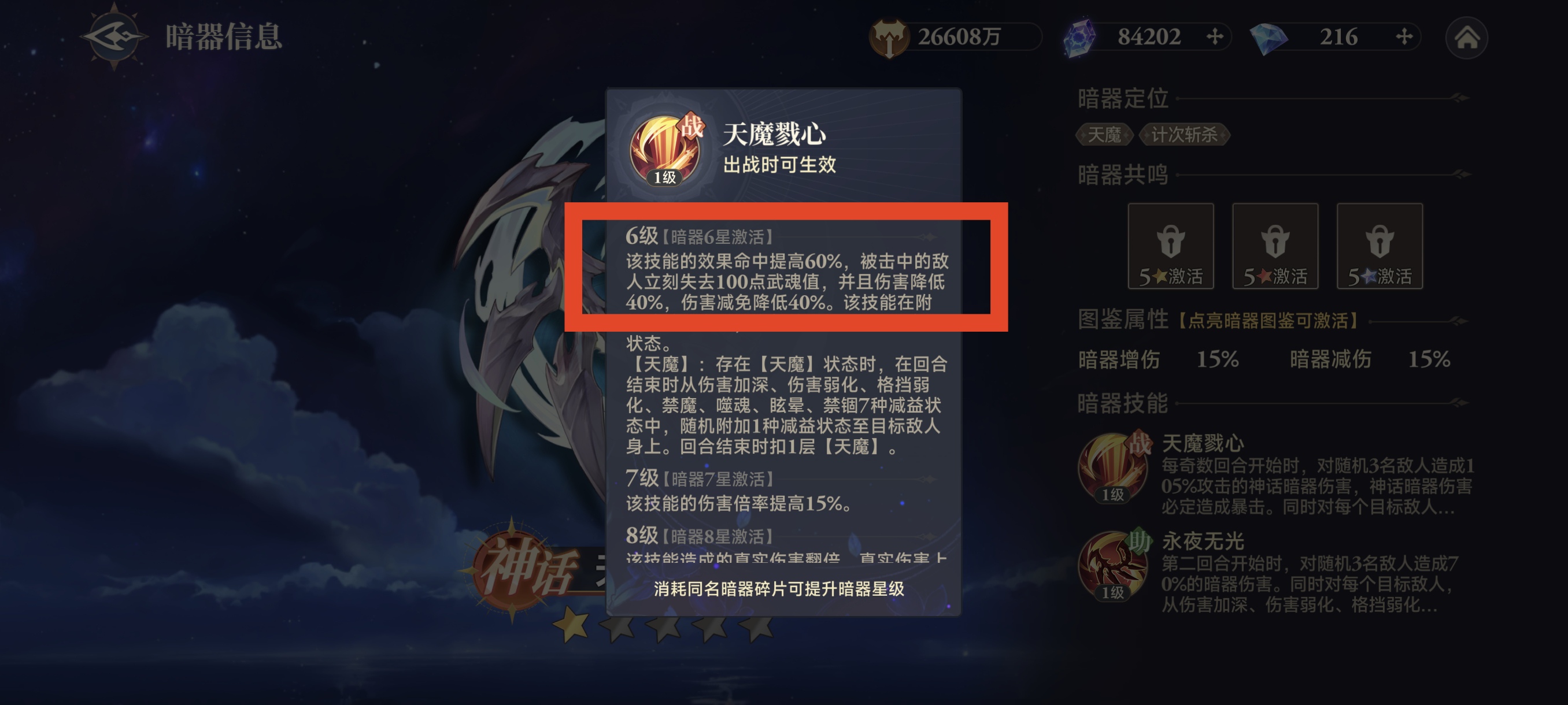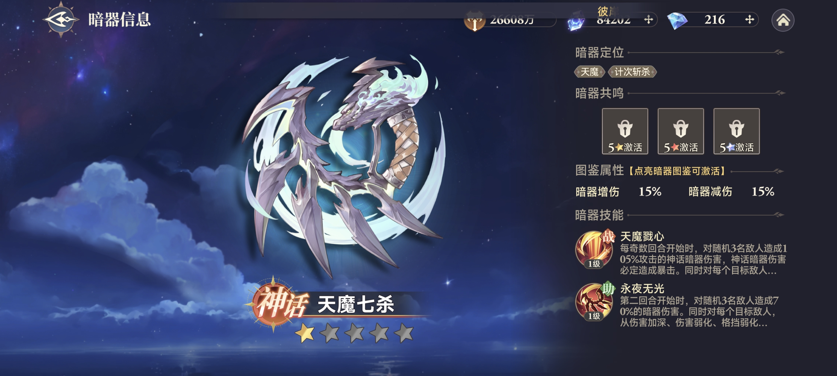 6星时解锁第一段效果,暗器在附加【七杀】时额外附加4层【天魔】状态。