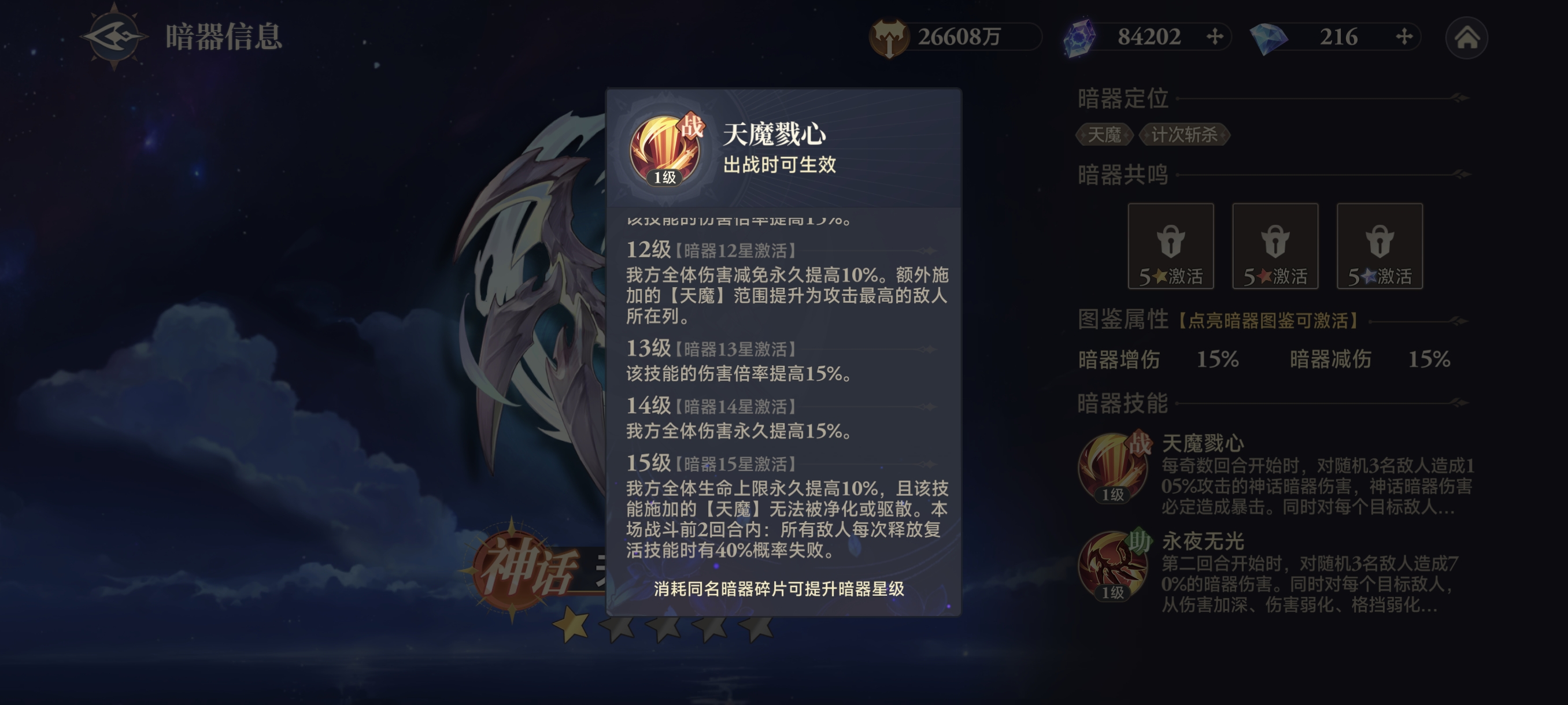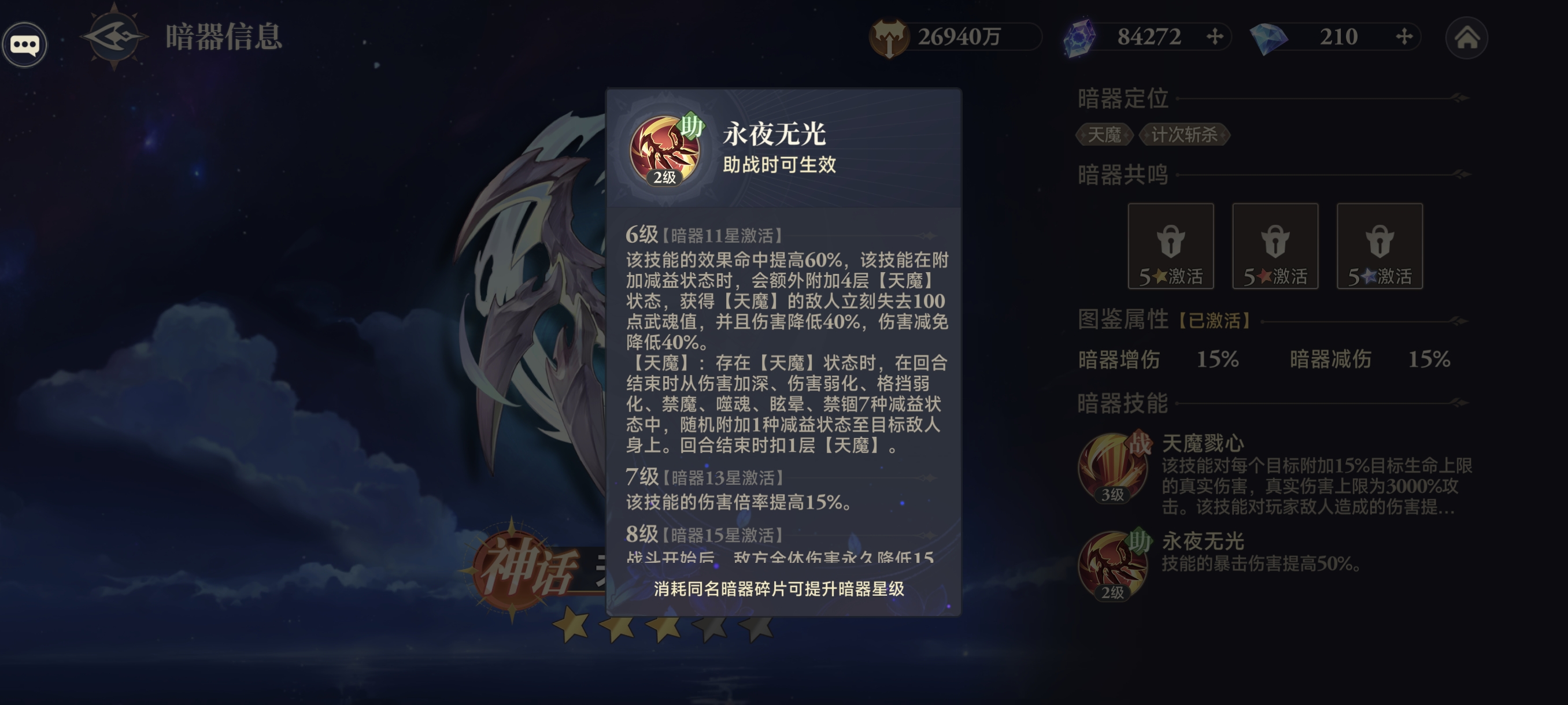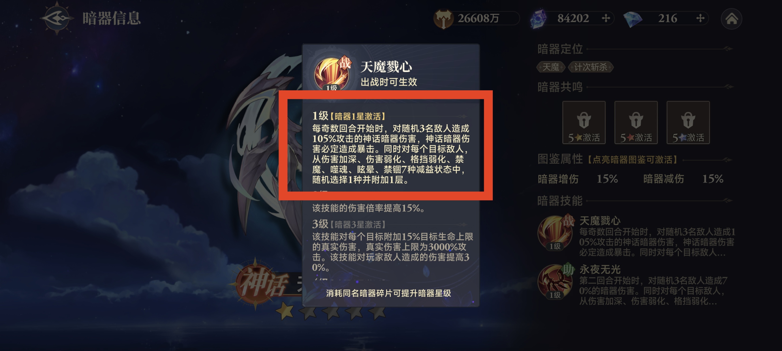 6星时解锁第一段效果,暗器在附加【七杀】时额外附加4层【天魔】状态。