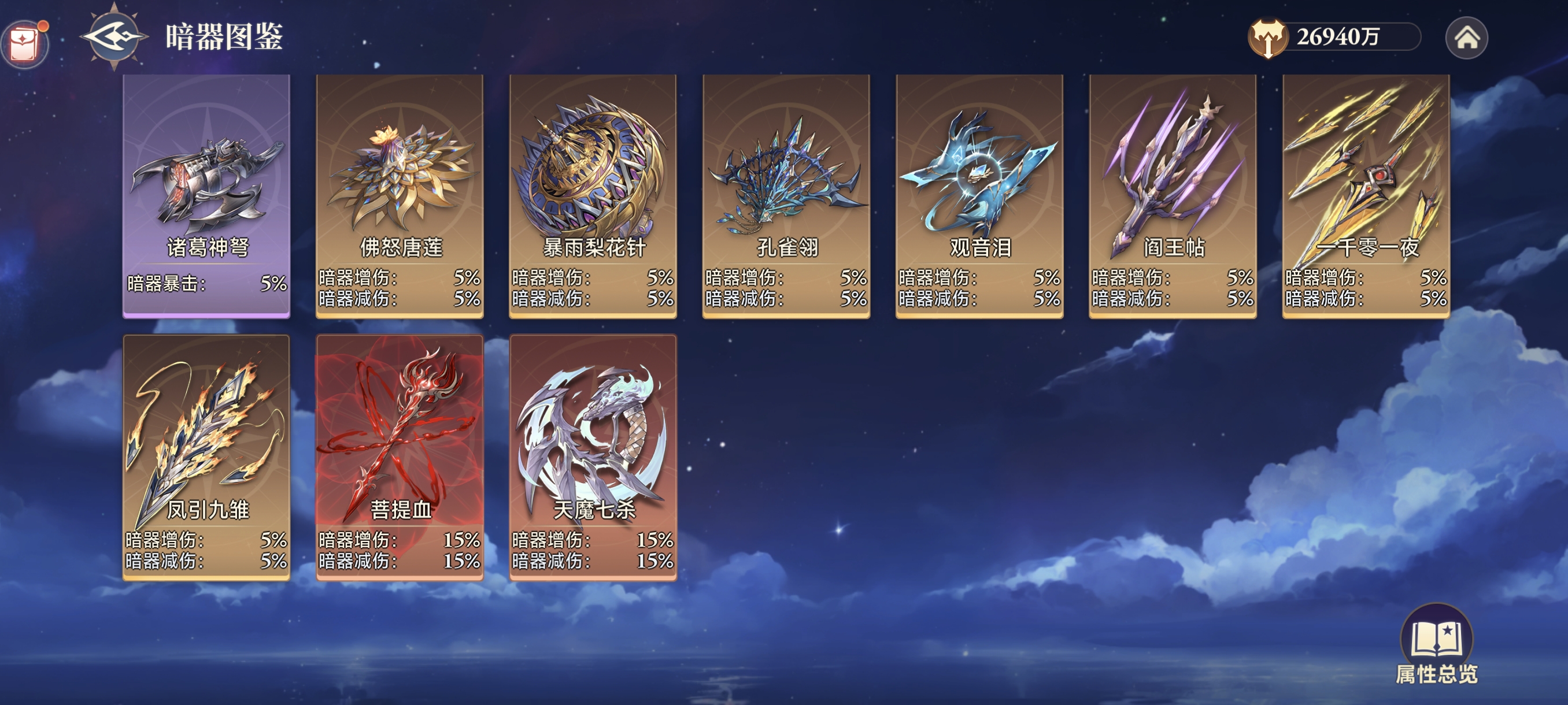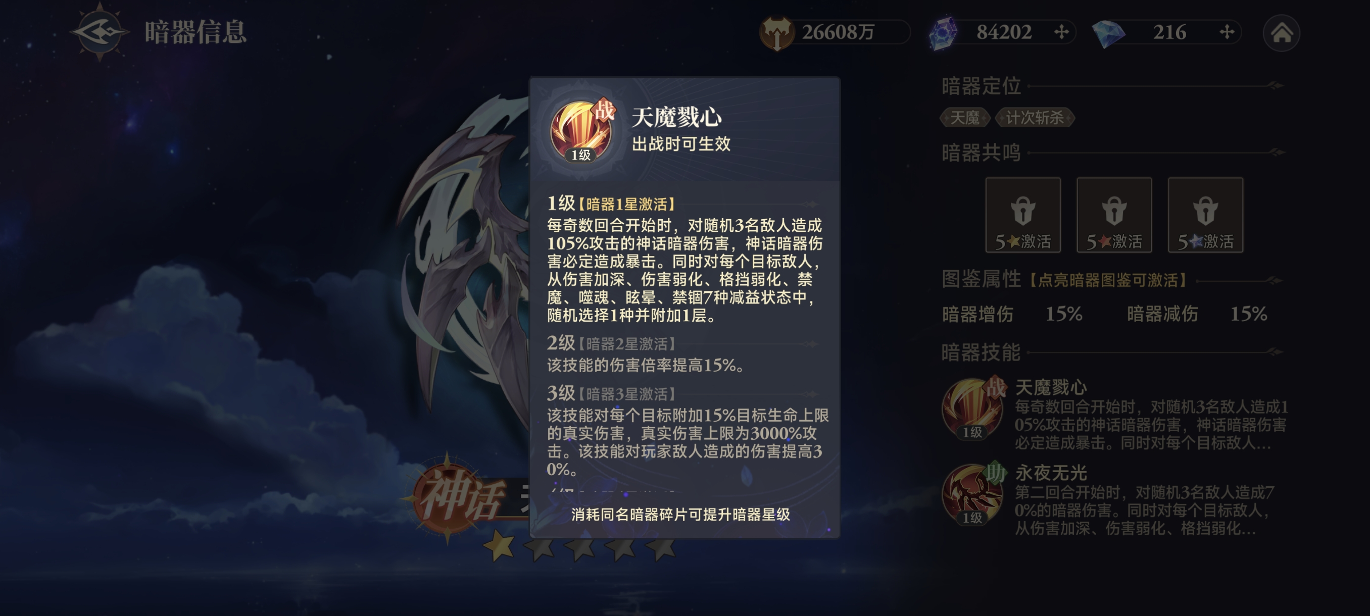 神话暗器1星均自带必定暴击特性,4星时解锁50%暴伤加成。