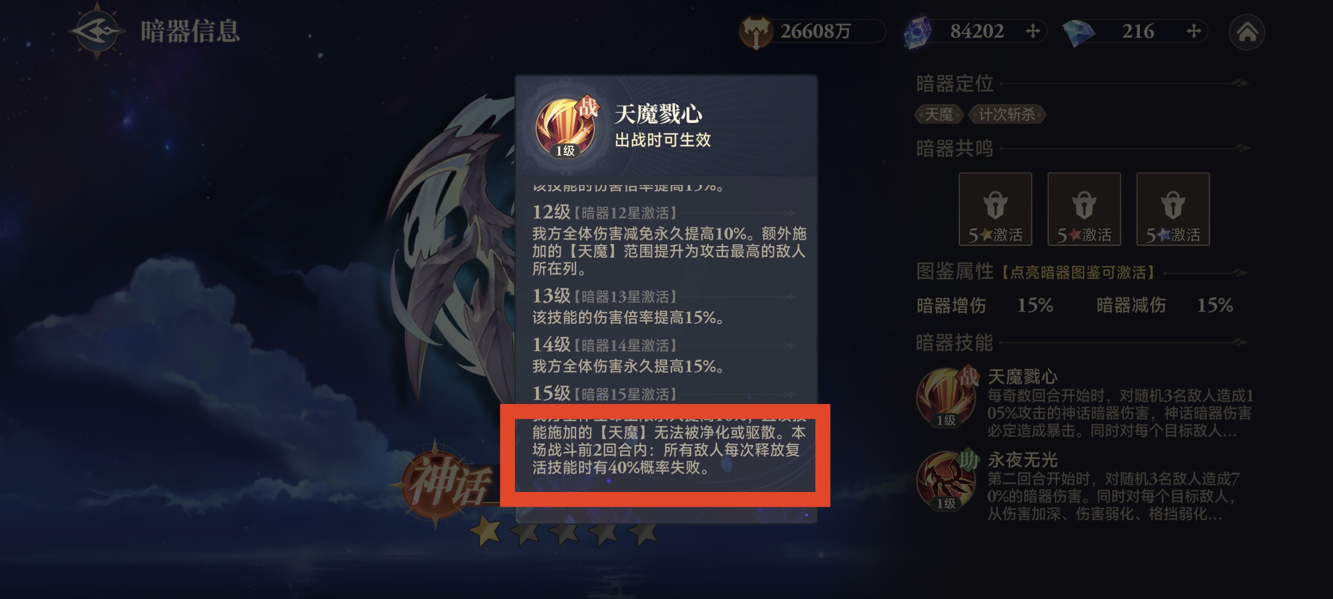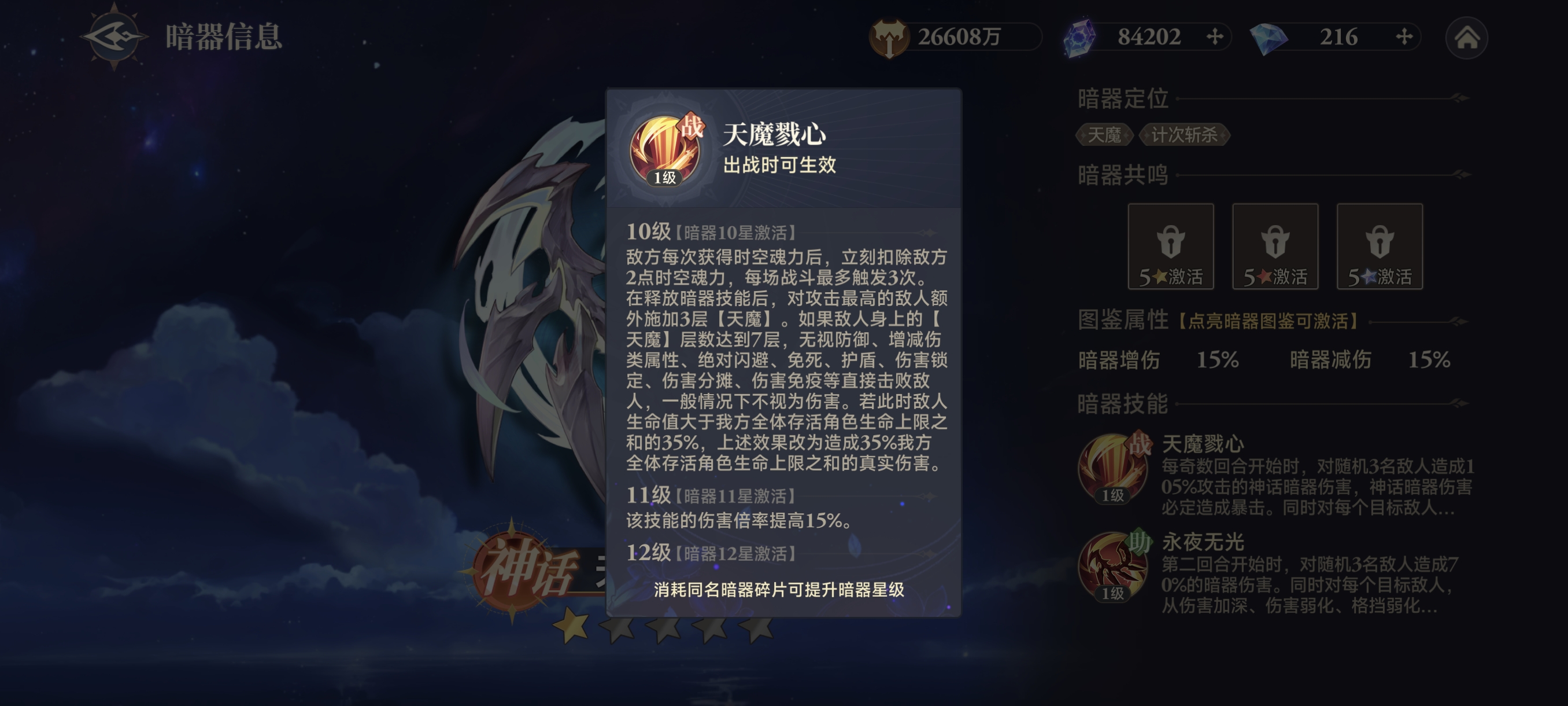 10星时解锁第二段效果,释放暗器后对敌方攻击最高目标额外附加3层【天魔】,并使天魔状态叠加至7层时,无视所有防御类效果直接触发即死秒杀目标。(若目标血量>35%我方总血量,则只造成35%总血量的伤害)