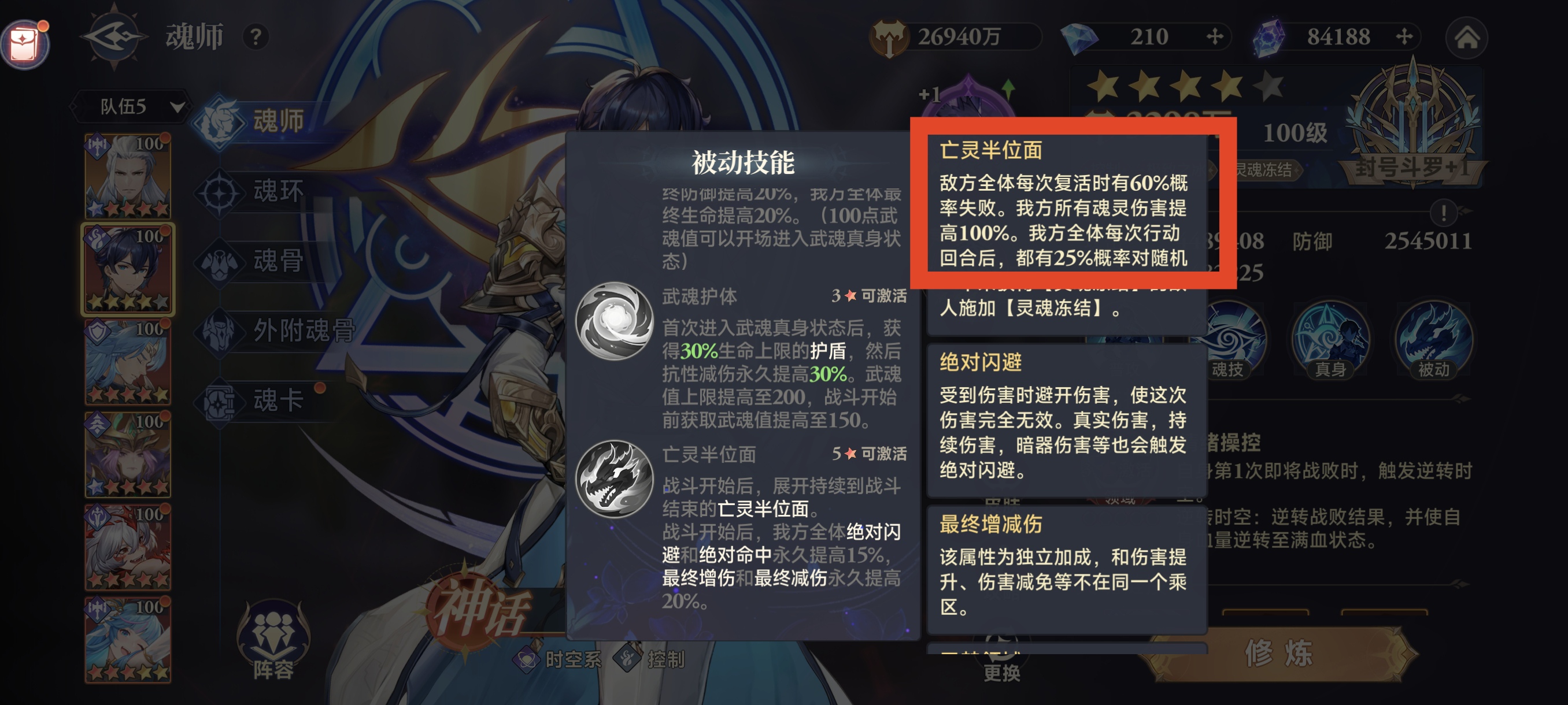 15星解锁,战斗前2回合内,复活有40%几率失败。霍雨浩的红5天赋【亡灵半位面】有60%使敌方复活失败,结合15星天魔七杀刚好是100%,前2回合必定阻止敌方复活,配合天魔或修罗小舞的即死秒杀效果,能让敌方开场直接强制减员!