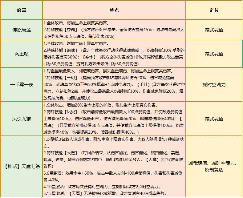 ※从上图可以看出,天魔七杀是最新控制型暗器,功能更加强大全面,不仅能够减武魂值和时空魂力,更是能够反制复活,大大改变了游戏环境。