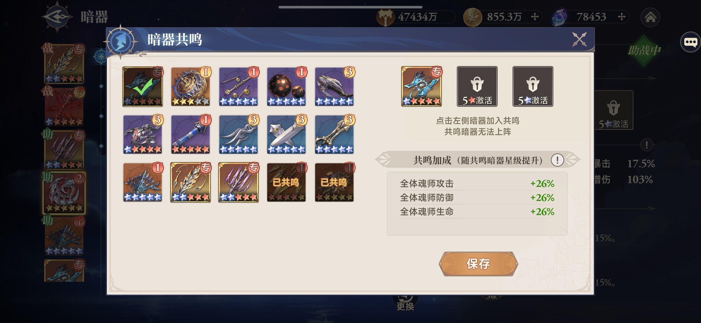 与“菩提血”一样,“天魔七杀”也拥有暗器共鸣(5星、10星、15星解锁),通过与不同品质、不同星级的暗器共鸣,为全体增加攻防血属性。