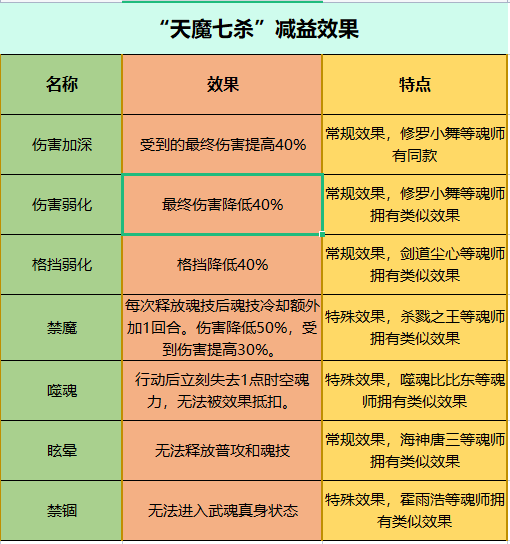 ①【天魔】在暗器6星解锁,效果命中+60%,被击中敌人立刻-100点武魂值,伤害和伤害减免各-40%,附加4层【天魔】。
