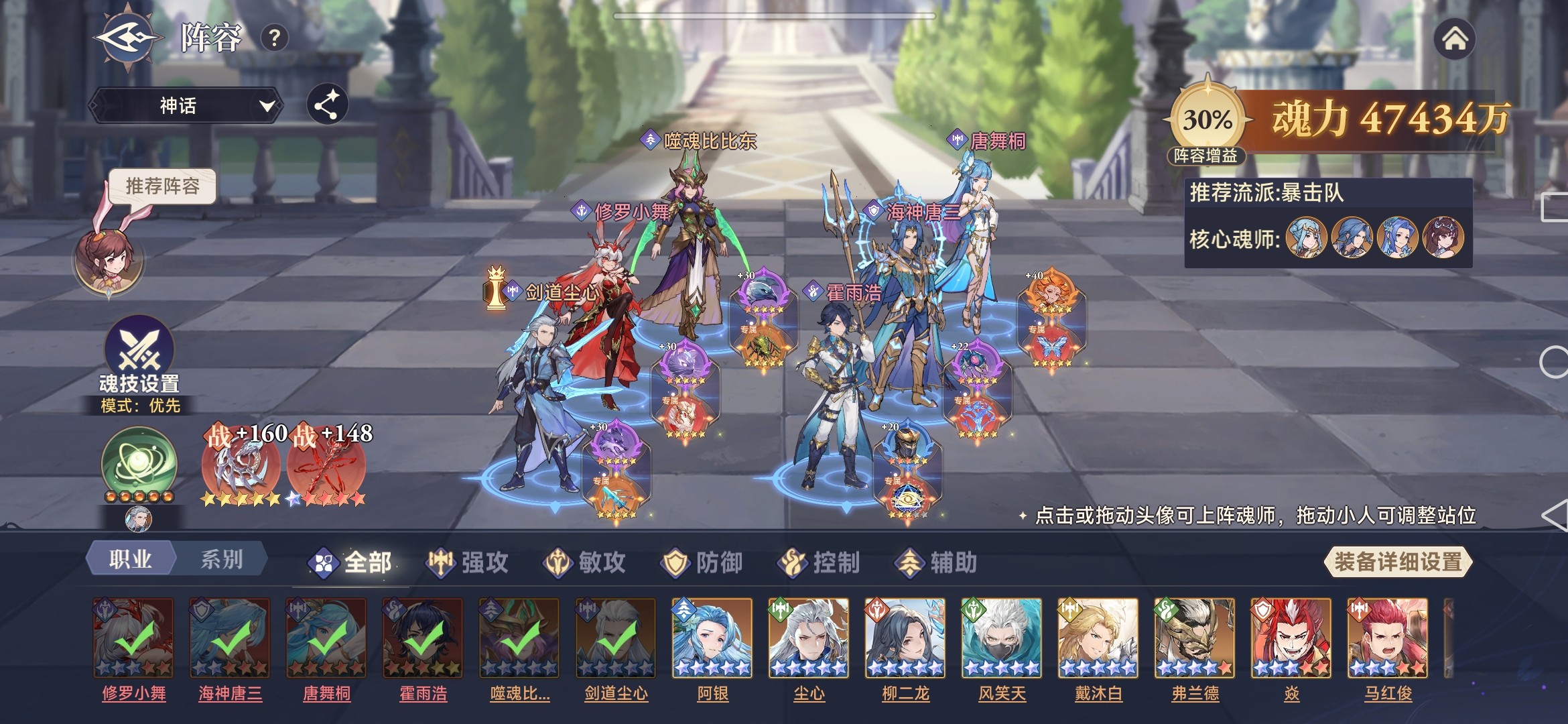以尘心暴击队为基础,以“天魔七杀”和凤引九雏为主战,助战为阎王帖、佛怒唐莲、一千零一夜,上阵霍雨浩、唐舞桐等时空魂师,主打普攻输出,有效应对“天魔七杀”减武魂环境。