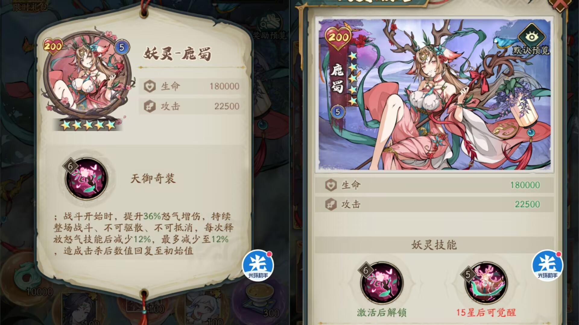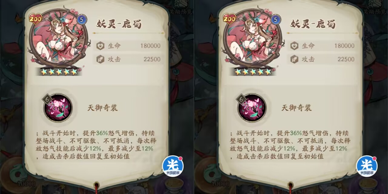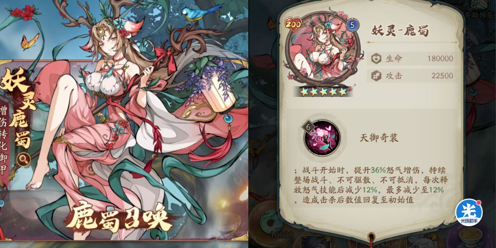 ③当【鹿灵】到达8星可以产生质变解锁:怒气增伤效果。难级情况战斗开始最大可以提供36%的怒气增伤,然后每回合削弱12%。这个效果不可被驱散和抵消。