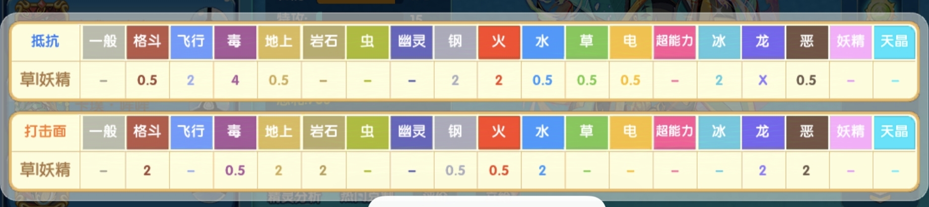 2倍抵抗格斗系、地面系、水系、草系、恶系和电属性,免疫龙系,2倍弱飞行系、火系、钢系、冰系,四倍弱毒系,当前环境还是非常舒服的,可以说抵抗面上十分出色,再看打击面,双本盲点有火和毒,不过还可以接受,用其他技能补盲,双本克制格斗、地面、岩石、水、龙、恶、6个属性,可以说它抗性上能抗很多主流的输出手,而且它作为输出宠物打击面还不弱,这就很给力了。