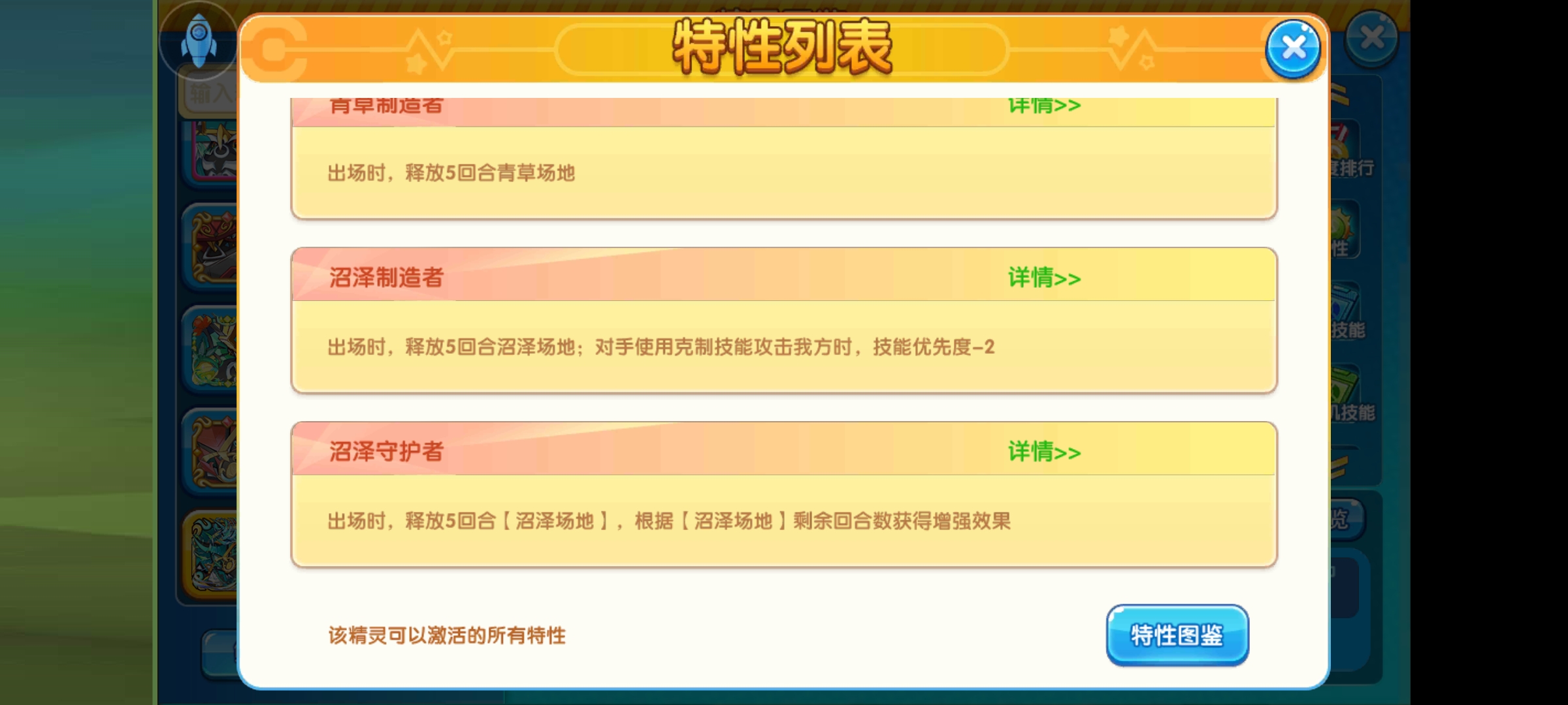第一个青草场地,第二个是原闪光特性沼泽制造者,如果没有后面一个,那么这个就是最优的了,但是有了后面的沼泽守住者,那当然是最新的更给力,沼泽守护者这属于原创特性,并不在原版有,效果是出场时,释放5回合沼泽场地,根据沼泽场地剩余回合数获得增强效果,回合开始时,物攻能力等级数值变为沼泽场地剩余回合数,最多+6,也就是一开始就加+6,受到伤害降低百分比=沼泽场地剩余回合数*10%,最多60%,随后沼泽场地回合数-1,这个玩法其实相当于另类爆发,首次上去肉度、输出都是顶点,以后慢慢回落,所以它完全可以玩极巨化,做到三回合全力爆发,这也很恐怖。这里再说下沼泽场地,它的效果自带草属性技能威力提升50%,还可以让场上精灵每回合结束能回复1/12血量,效果也不错。