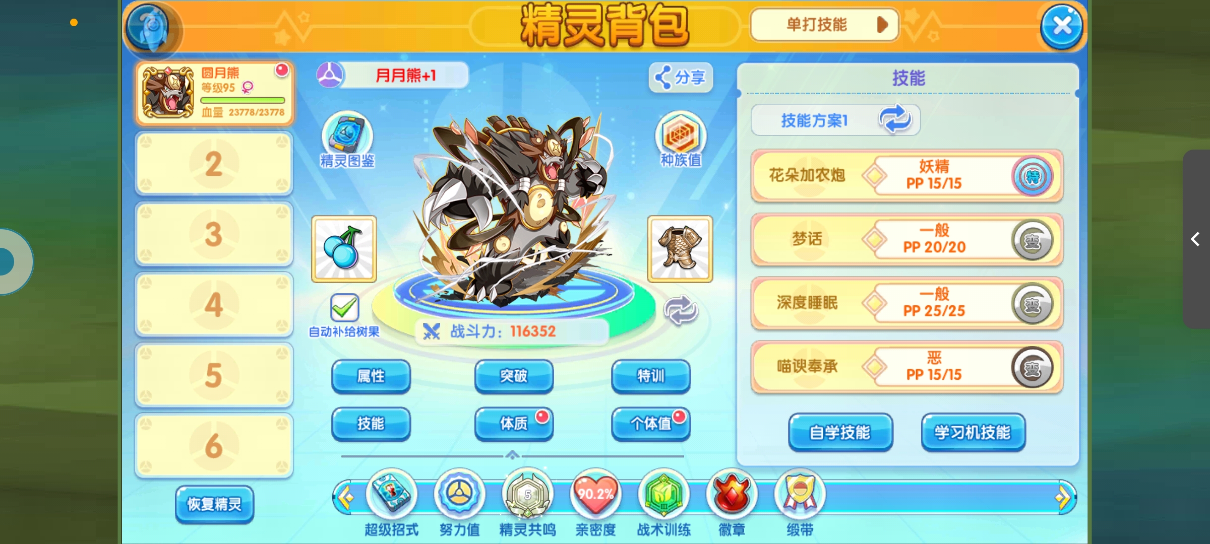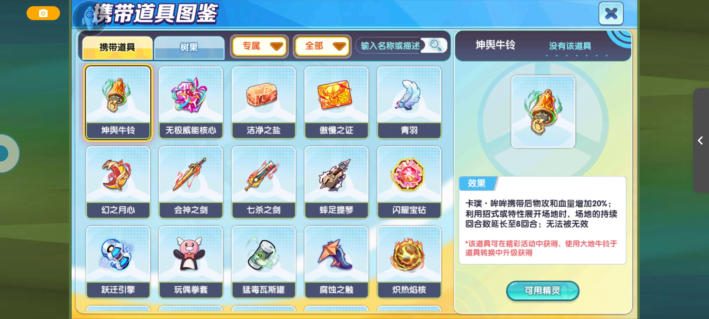 最推荐专属铃铛,原来的效果是提升肉度的同时,还让它无法陷入黑色目光状态,让它不怕捉,不过加强后的坤舆牛铃效果更好,携带后直接物攻和血量增加20%;利用招式或特性展开场地时,场地的持续回合数延长至8回合,还不怕落拳,也不用担心极巨回合攻击下滑。