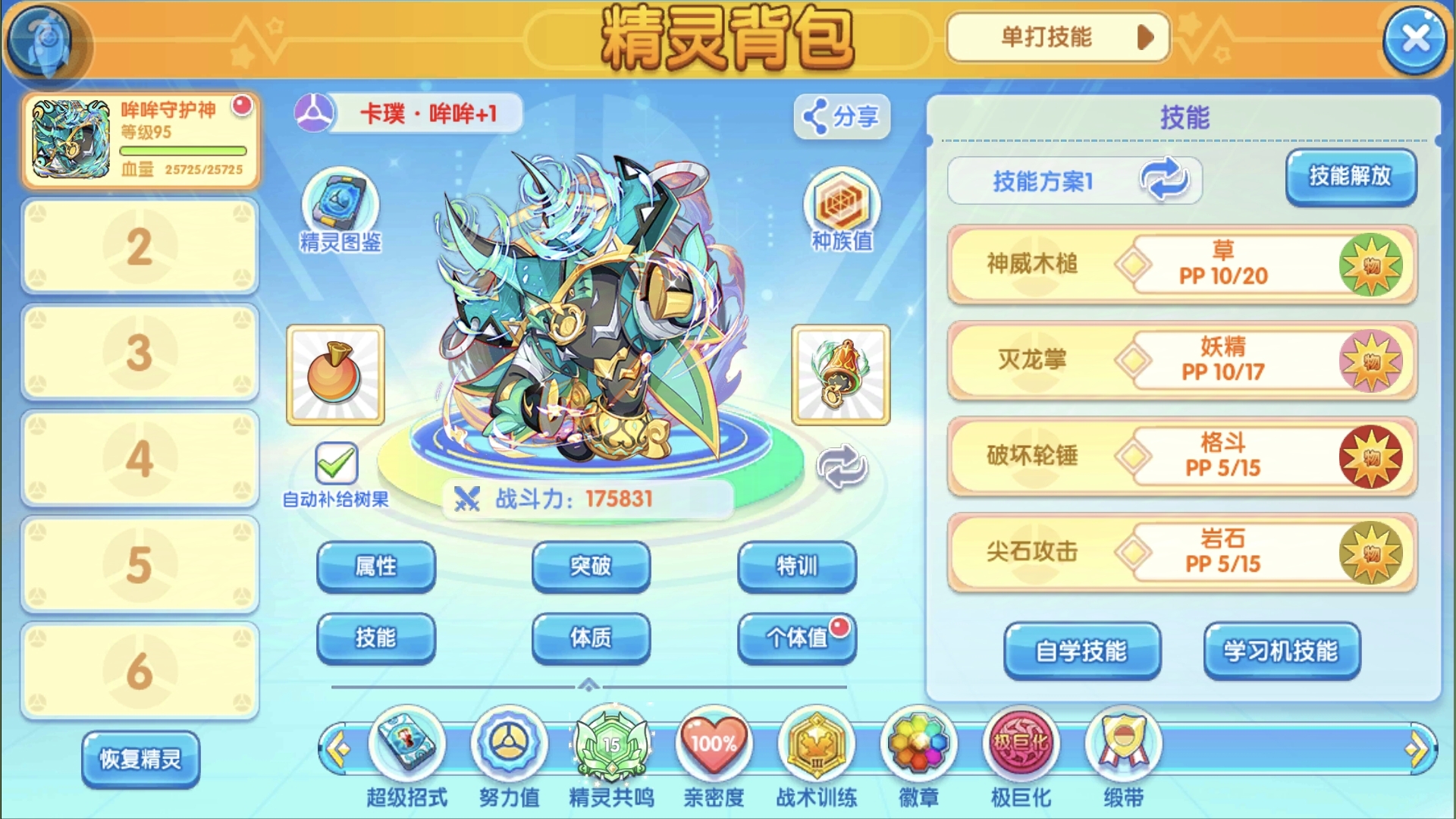 这里草本就是神威木锤,这个没什么好说的,因为特效是如果攻击无法造成效果很好的伤害,100%概率将对方砸下场,在沼泽场地上,威力增加30%,虽然威力不如哪些特别暴力的,但是特效好用,遇到克制的凭借攻击伤害直接秒,遇到不克制的锤下去再打下一个。而妖本极巨的话还是灭龙掌收益最高,毕竟也拥有极巨特效,因为哞哞本来速度一般,而这个技能就让它面对克制拥有先手优势,因为草和妖精都被钢抵抗,第三个技能破坏轮锤当然就来了,高威力加克制特效,一般带钢系的精灵都扛不住,补盲的超能系实体攻击也可以,可以用来打虚妹,然后岩石系的滚动岩锤的好处的是面对速度低的更肉,尖石的话是极巨有优势,选择哪个就仁者见仁智者见智了。