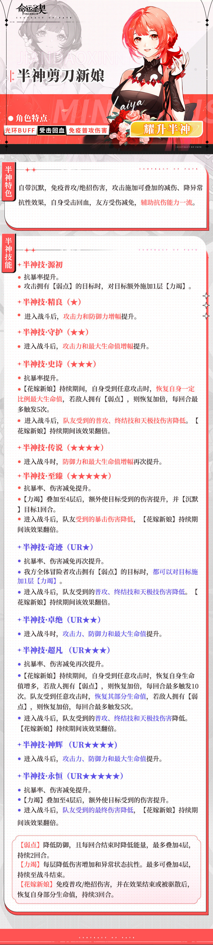 「剪刀新娘」耀升半神!染上红发霸气回归!光环小G发布于 2025-04-18关注对团长有强烈爱意的结婚狂。如同婚纱一般纯洁的剪刀新娘有了新的蜕变,正式耀升半神!半神剪刀新娘将陪伴团长,直到海枯石烂的那一天——半神「剪刀新娘」,从如同婚纱一般纯洁的形象,到如今穿着黑纱染着红发的高贵女神,如果给半神剪刀新娘配上台词,团长认为应该是什么呢?