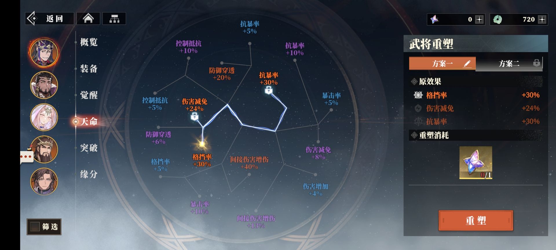 每个武将共有16条天命属性,其中橙色5条(高档)、紫色6条(中档)、蓝色5条(低档)。