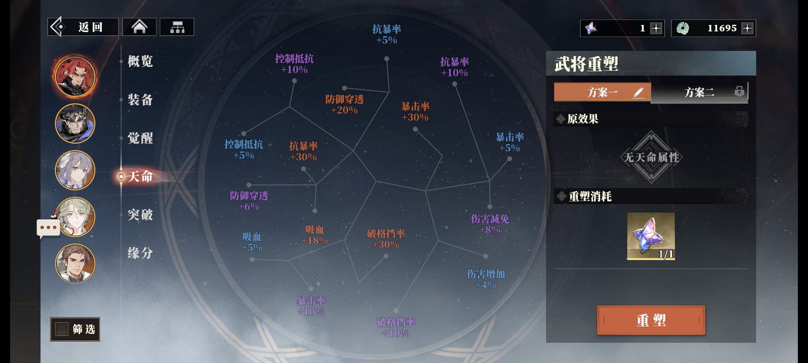 每次重塑需要消耗1个命石,然后从所有天命属性中随机刷新出3个词条,分别于40级、55级、70级时解锁。