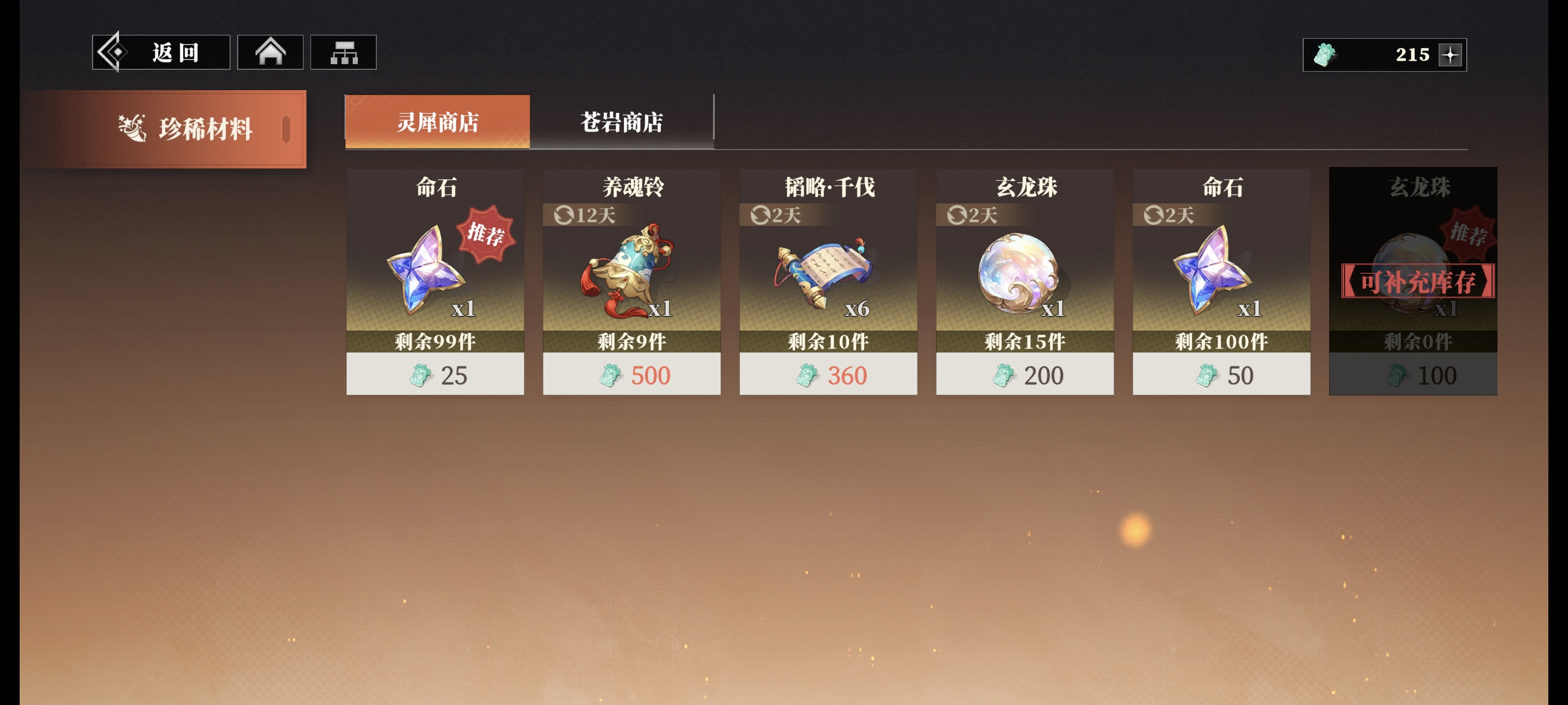 一种是一次性兑换的命石(不刷新),价格是可刷新命石的一半,25灵犀玉/个,上限100个。