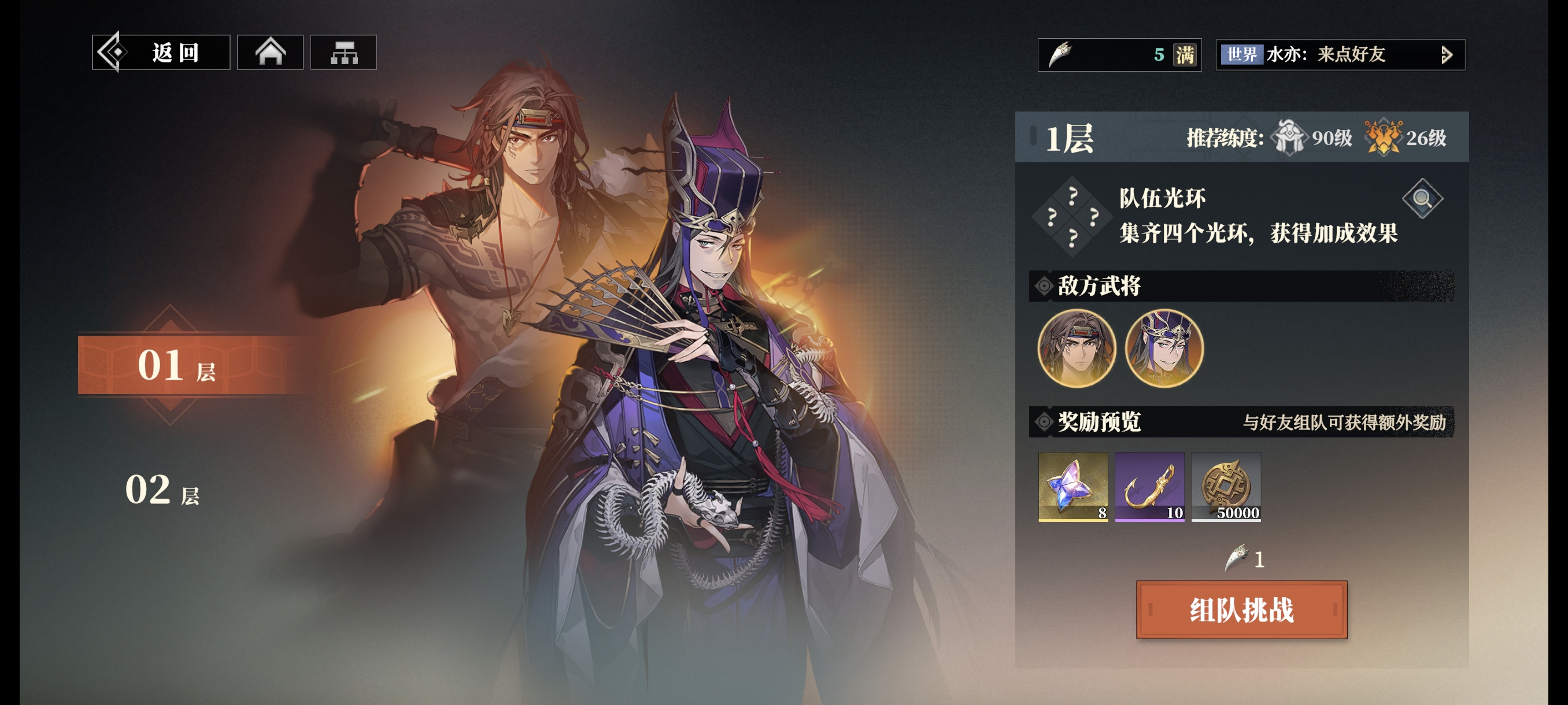 每天5点时刷新1张星渊阁门票,通过组队挑战的方式战胜BOSS后,可根据星渊阁层数获取一定数量的命石。