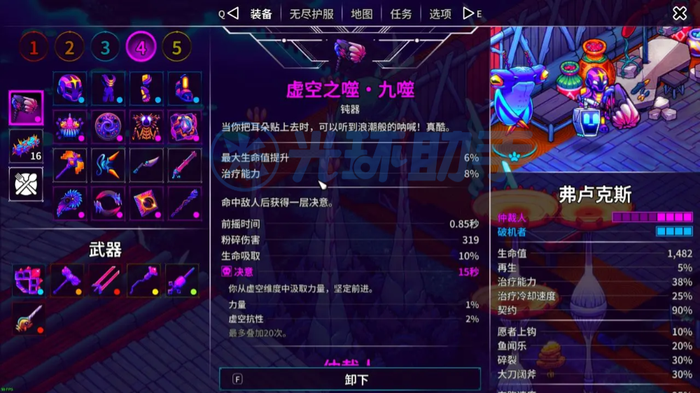 扁头蝙蝠搭配虚空装备输出与防御双全,伤害、回血、抗性一把抓。