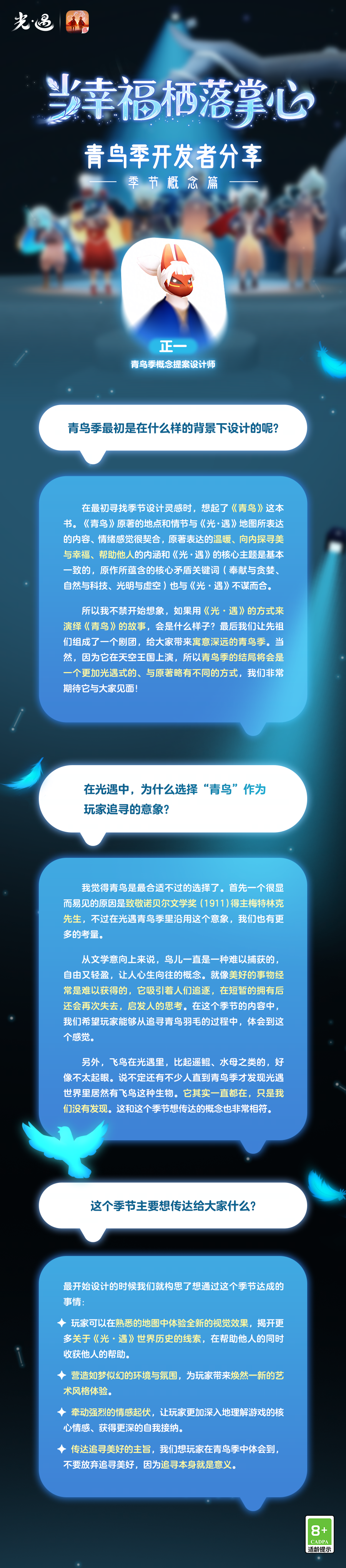 季遇青鸟 幕后揭秘|奇妙之旅:青鸟季开发者分享是泽哦发布于 04-18关注一键走进青鸟季的创作幕后了解季节的创作背景、选择青鸟作为追寻意象的原因、想传达给大家的主旨……🗒️一起听听青鸟季开发背后的故事吧!