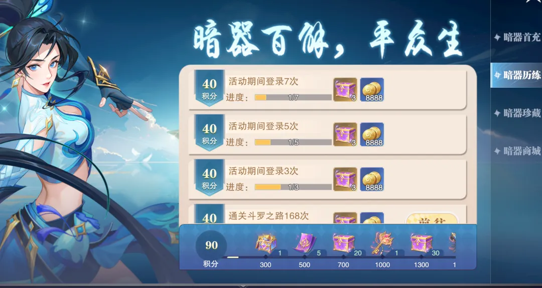 接着我们来说说暗器修行的这个分支活动,每日充值30元可以获得一份奖励,接着暗器历练是一个通过完成任务来获取积分的活动,总计分数上限为2060分,而想要拿到5个馈赠秘藏是需要达到2000分才行,其中部分的任务我们就需要花点体力来打够次数才行了,大家注意每日的积累。