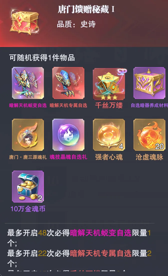 此外完成任务还能获得修行秘藏,通过这部分任务上限可以拿到200个修行秘藏,而每开启20个修行秘藏是可以保底获得1个馈赠秘藏的,相当于这部分最多能够拿到10个馈赠秘藏,外加2000积分的5个就是共计15个馈赠秘藏,但馈赠秘藏需要开启22次才能获取暗三的专属魂骨,然后需要开启48次才能获取暗三的进化魂骨,因此如果大家想要获取暗三专属魂骨的话,就需要额外购买4个6元礼包才行,而如果想要拿到暗三的进化魂骨的话,则需要额外购买26个6元礼包才行,共计是156元,大家还请注意。