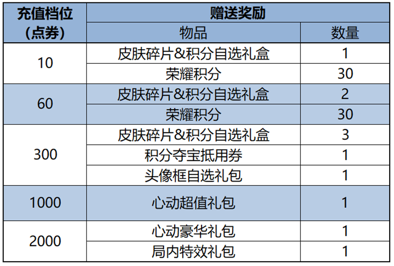 皮肤碎片&积分自选礼盒:打开礼包可任意选择以下奖励之一:荣耀积分*10或皮肤碎片*1