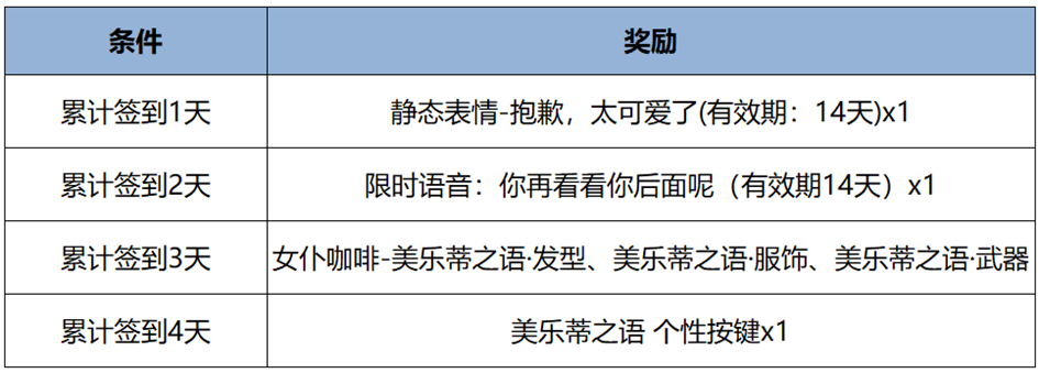 活动奖励:玩家参与活动累计签到可获得妲己-女仆咖啡-美乐蒂之语、皮肤对应个性按键、三丽鸥家族联动表情-抱歉,太可爱了(14天)、限时语音:你再看看你后面呢(14天)