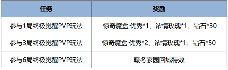 活动期间完成终极觉醒PVP对局任务可获得暖冬家园回城特效、惊奇魔盒等奖励